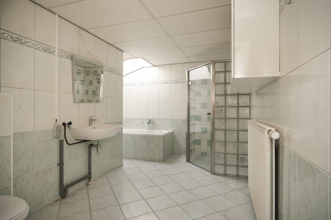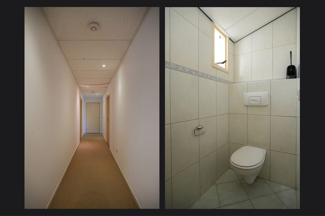 1e verdieping achterzijde: overloop, volledig betegelde badkamer voorzien van wasmachine aansluiting, douche, toilet en wastafel, overloop voorzien van lichtstraat, 6 kantoorruimtes, kantine met keukenopstelling.