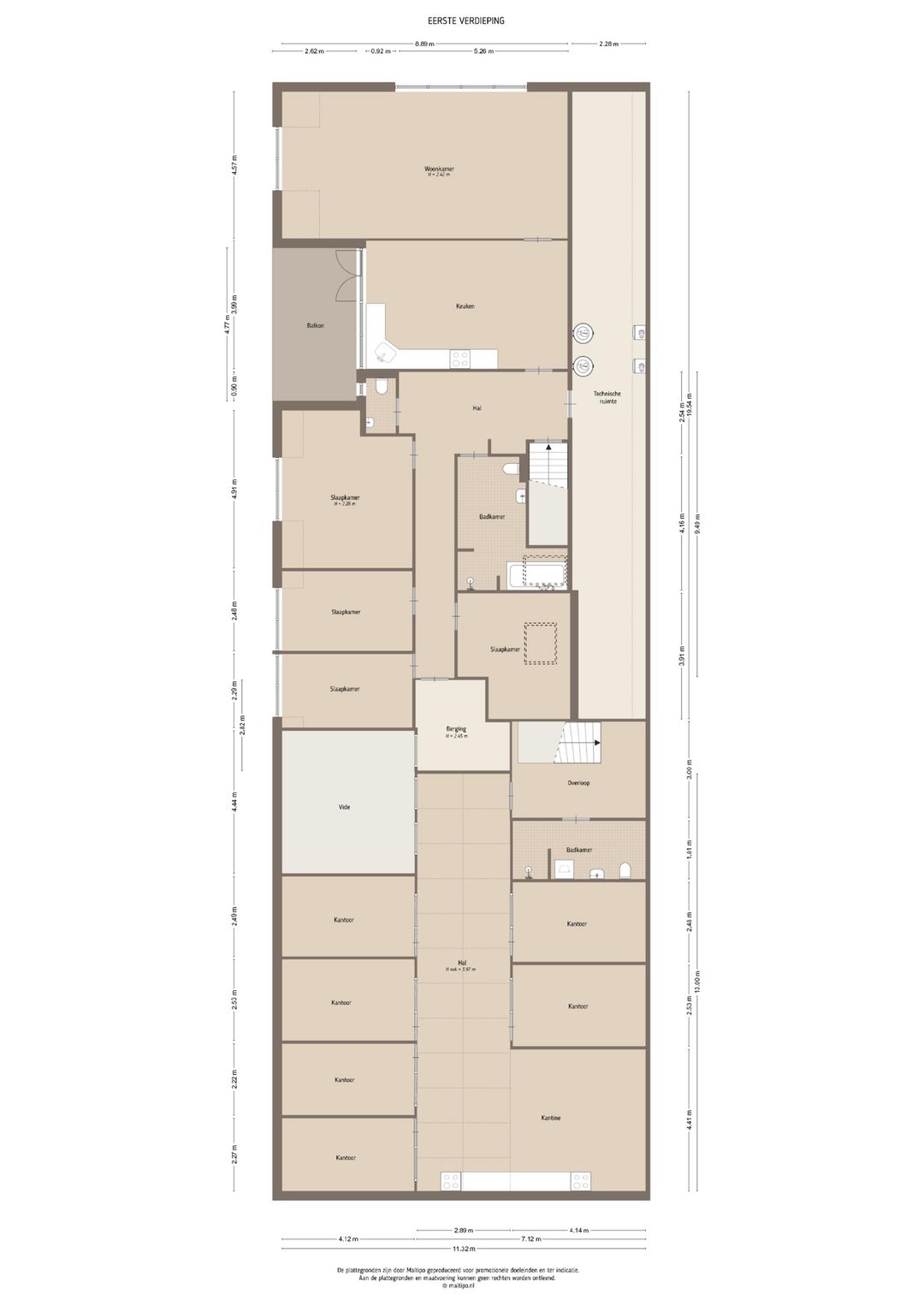 Het kantoorgedeelte op de begane grond is ca. 221 m² VVO groot.
