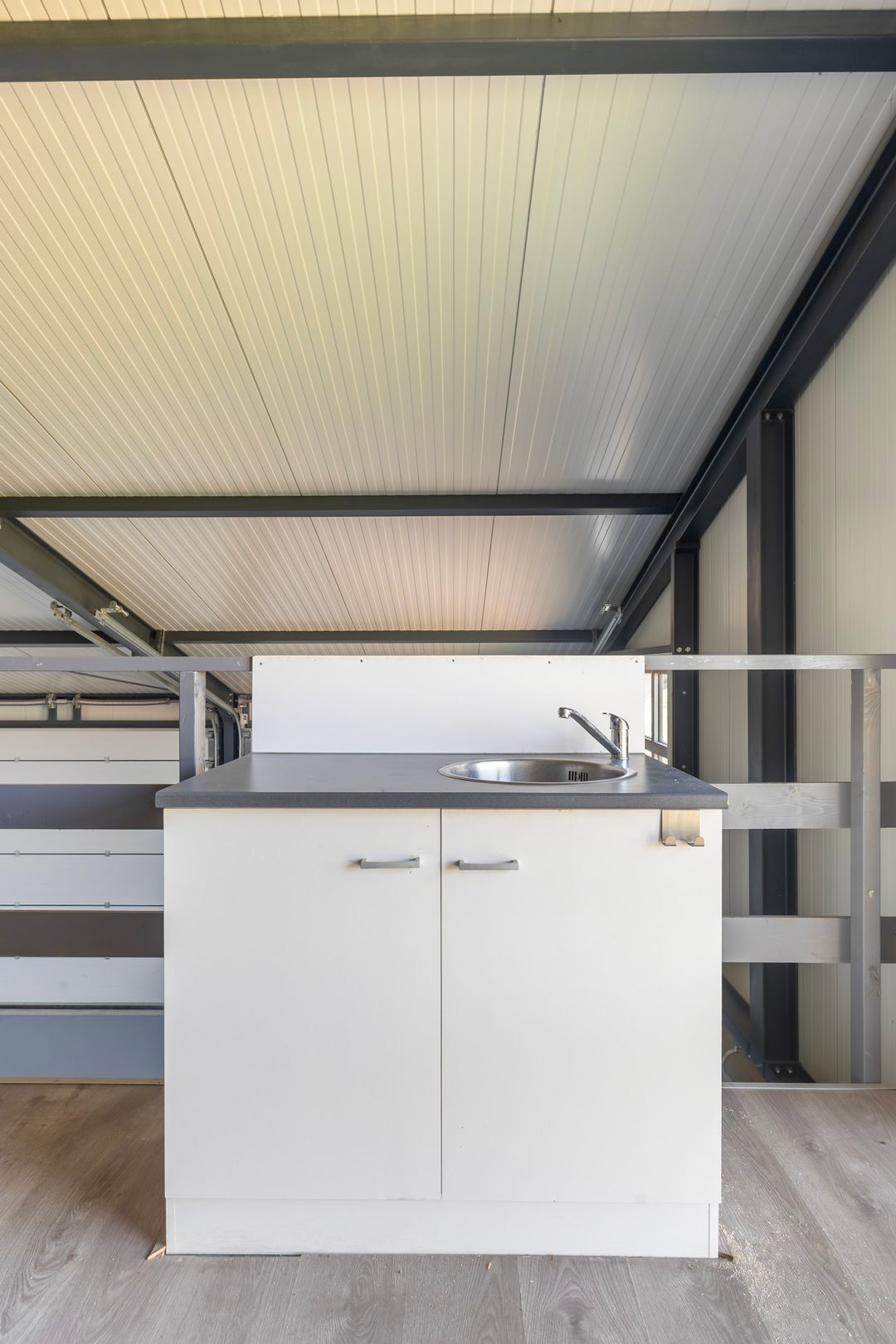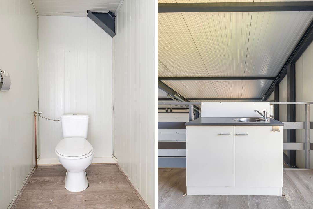 Op de verdieping zijn een toilet en een keukenblokje aanwezig, ideaal te gebruiken zoals kantoor of kantine.