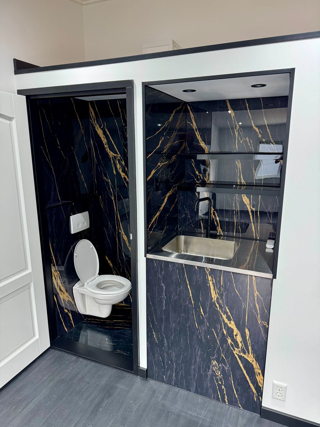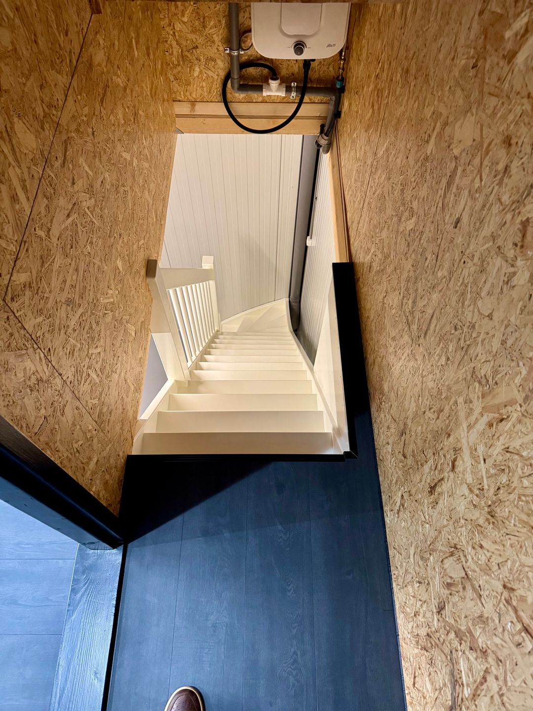 Op de verdieping is een moderne en extra geisoleerde kantoorruimte gerealiseerd met keukentje en toilet.