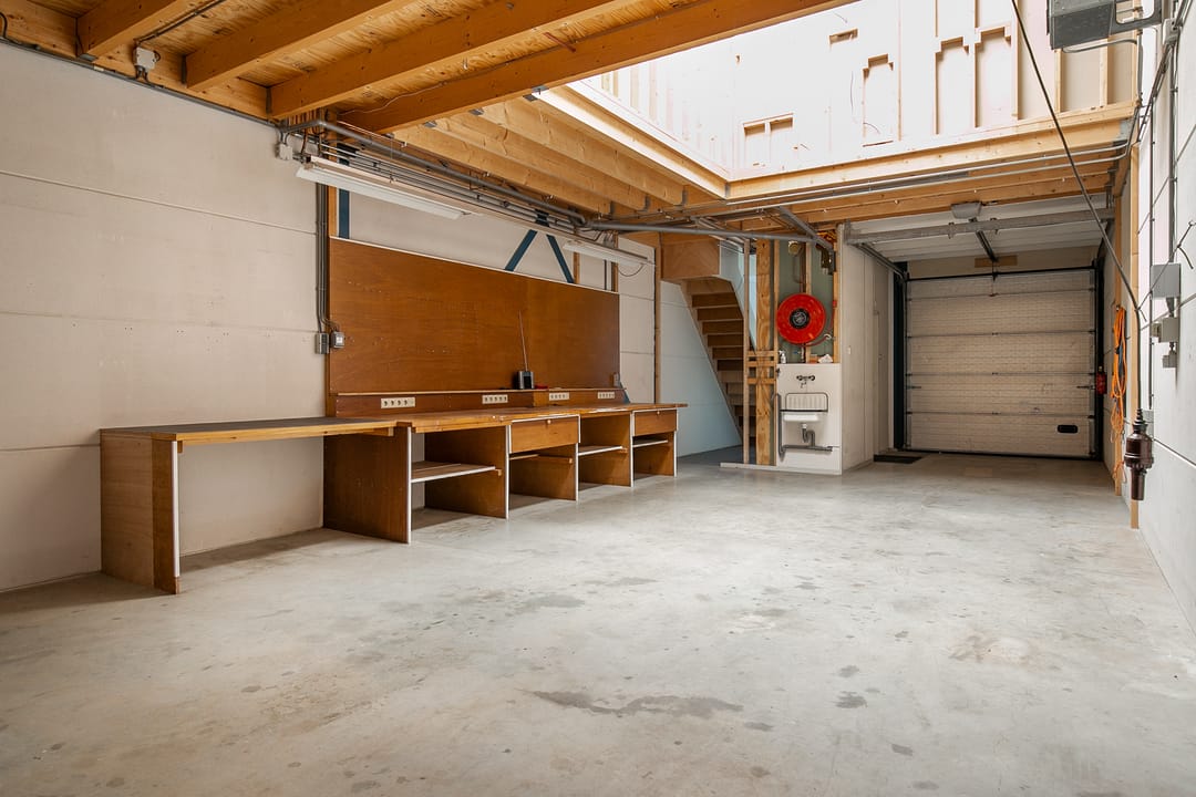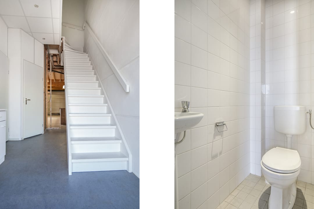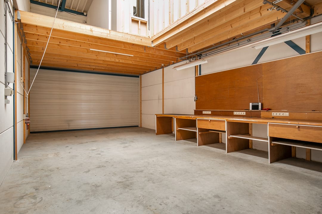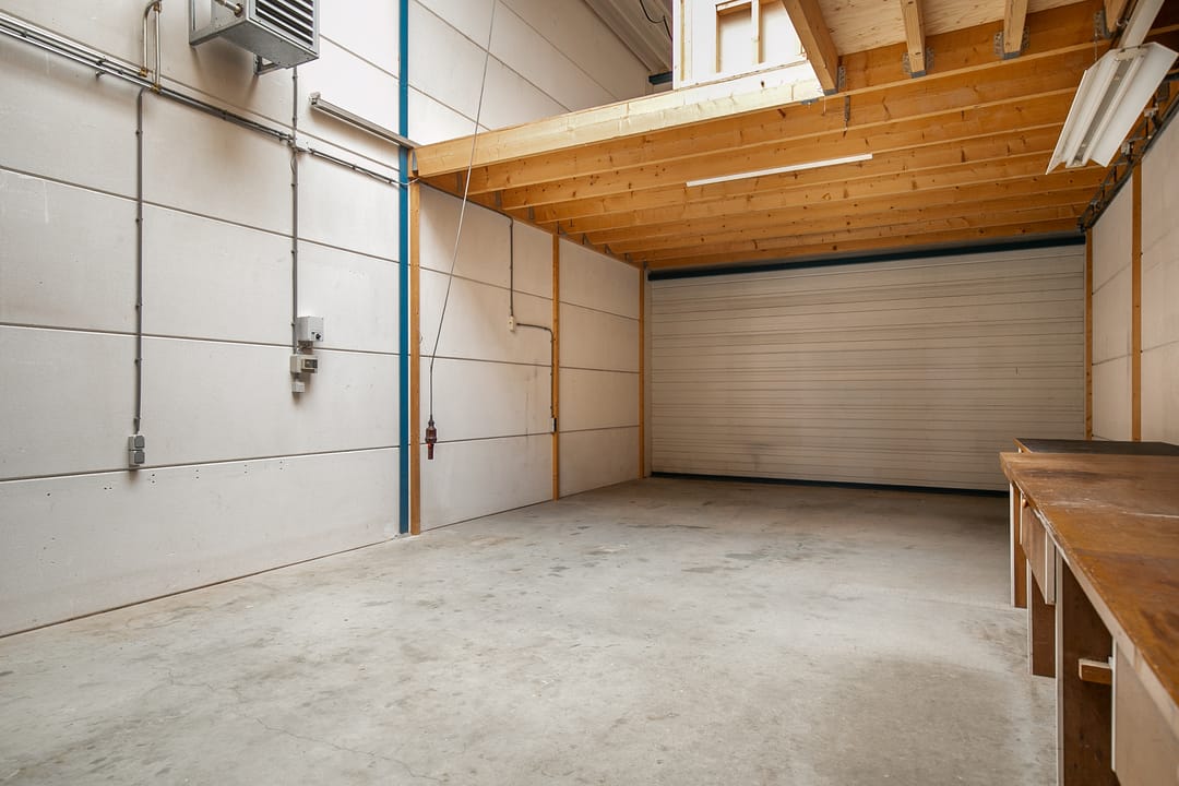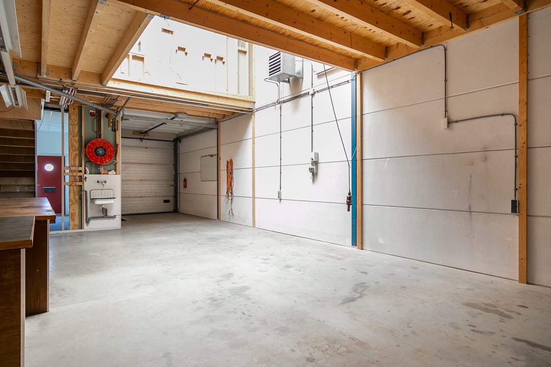 De bedrijfsruimte op de begane grond beslaat circa 76 m² en is voorzien van een loopkat met elektrische kettingtakel, ideaal voor uiteenlopende werkzaamheden of opslagdoeleinden. Op de eerste verdieping bevindt zich een verzorgd kantoorgedeelte, geschikt als werkplek of aanvullende opslagruimte.