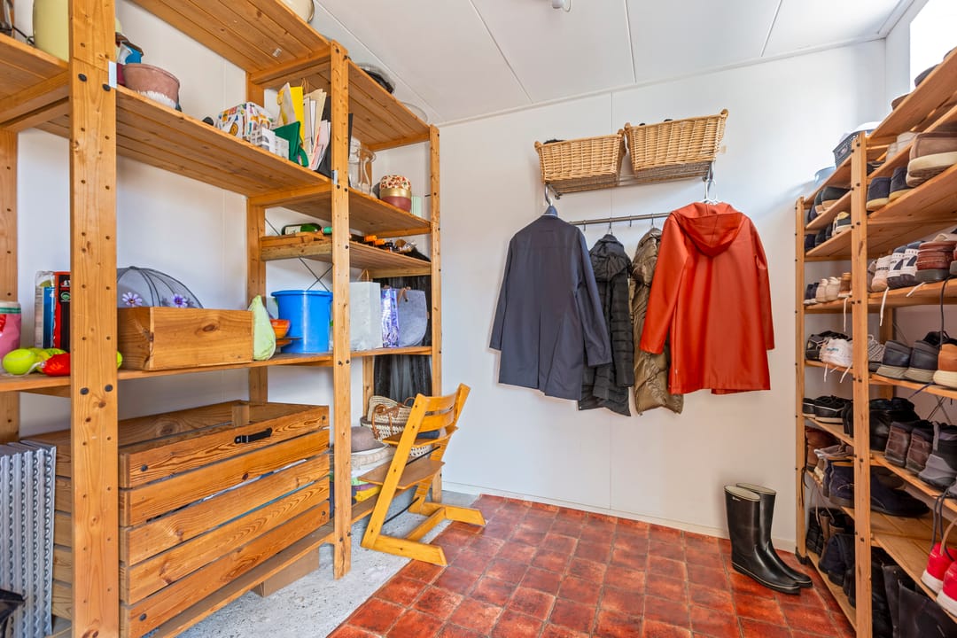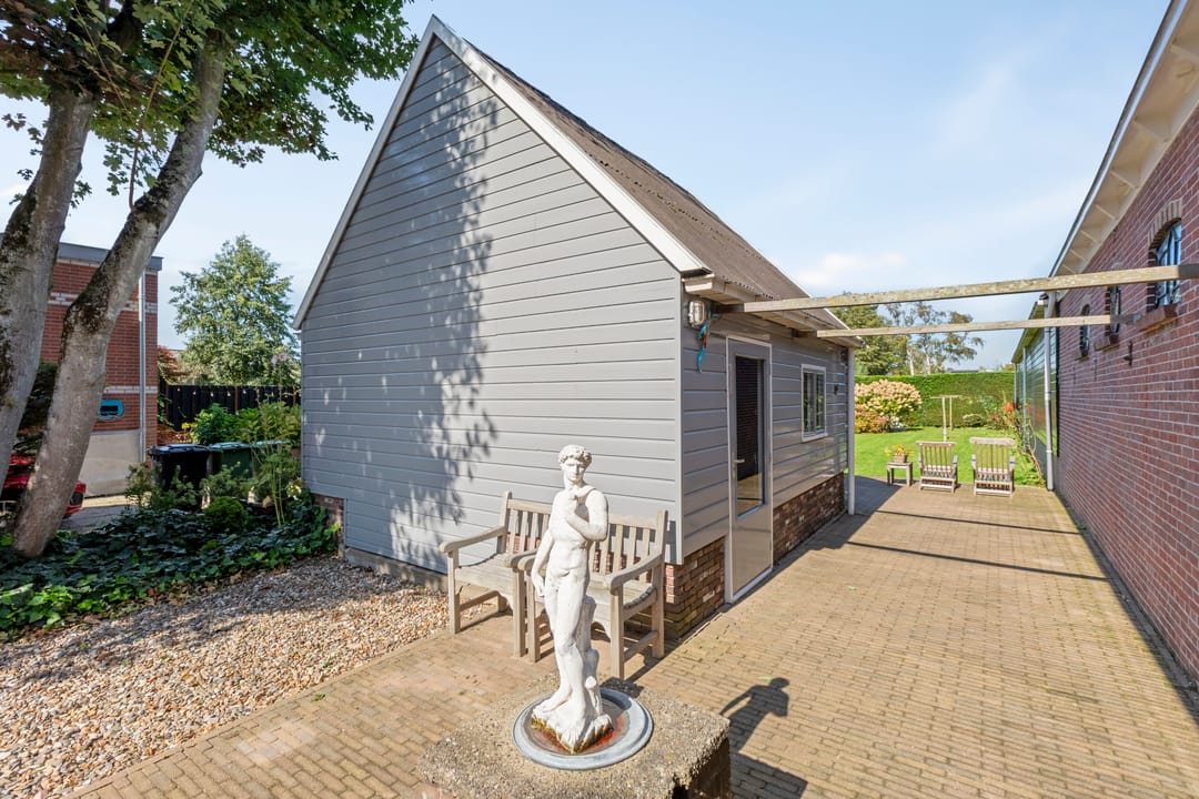 Aan de zijkant van de woning bevindt zich een groot voorterrein waar meerdere auto’s op eigen terrein geparkeerd kunnen worden. Daarnaast is er een vrijstaande houten schuur aanwezig.
