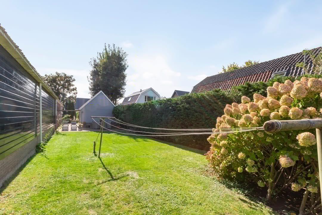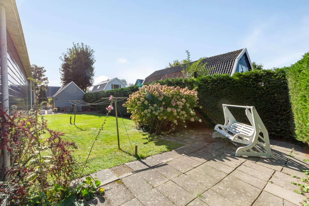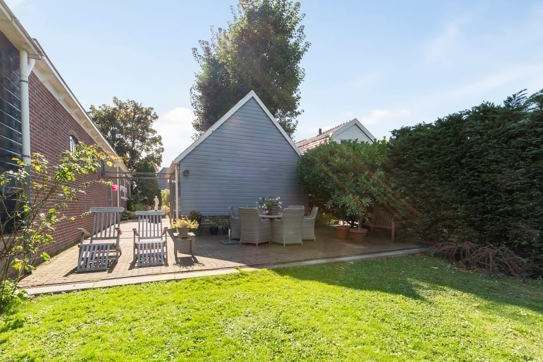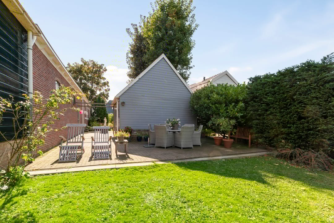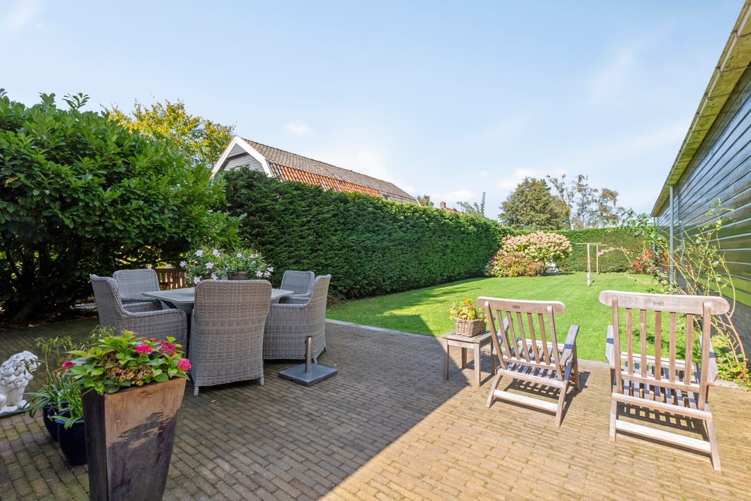 Het woonhuis beschikt over een royale, verzorgde tuin rondom, omsloten door groene hagen, die veel rust en privacy biedt. Op ieder moment van de dag is er een zonnig plekje te vinden, zowel in de tuin als binnen door de goede lichtinval.