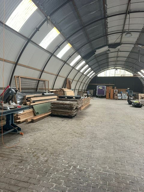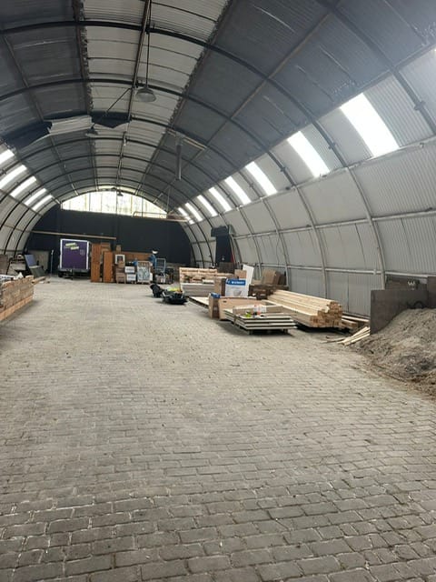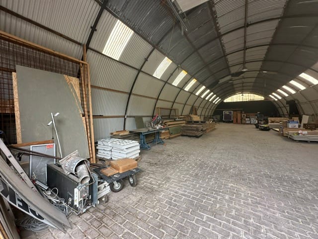 De loods kenmerkt zich door een royale lichttoetreding dankzij de strategisch geplaatste ramen en lichtpanelen, wat zorgt voor een prettige werkomgeving en een open karakter. De vloer is uitgevoerd in klinkerbestrating, wat een duurzame en onderhoudsvriendelijke ondergrond biedt, geschikt voor uiteenlopende gebruiksdoeleinden.