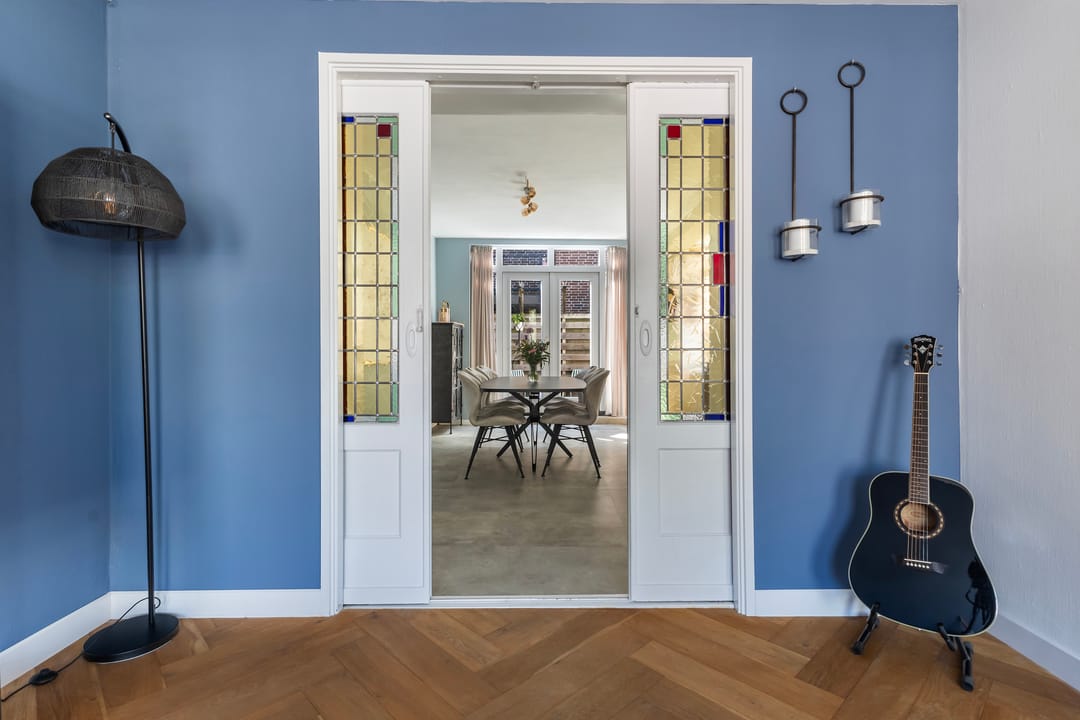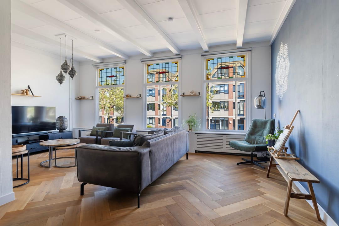 De zelfstandige bovenwoning is verdeeld over twee verdiepingen en in 2023 grondig gemoderniseerd. De eerste verdieping beschikt over een lichte woonkamer met hoge raampartijen en glas-in-looddetails, een kamer-en-suite indeling en een luxe woonkeuken met openslaande deuren naar een besloten dakterras van ca. 15 m². De tweede verdieping biedt drie slaapkamers en een complete badkamer met dubbele wastafel, inloopdouche en tweede toilet. Installaties en afwerking zijn grotendeels vernieuwd (o.a. elektra, riolering en ventilatie).