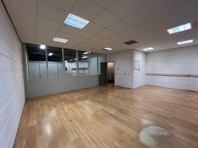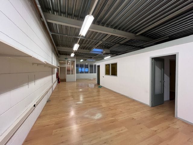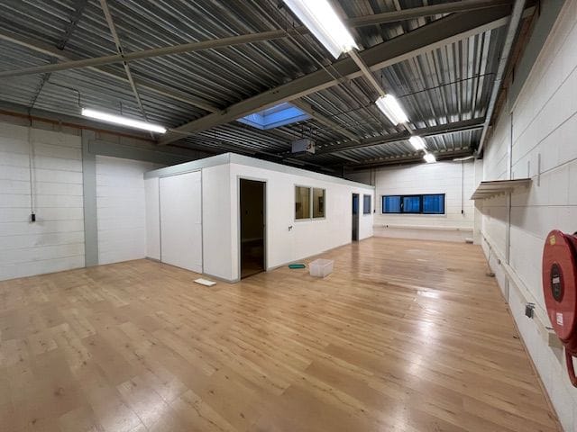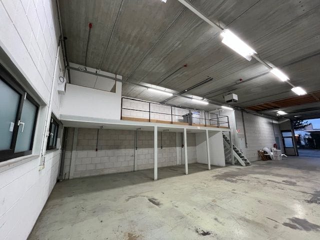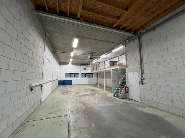 - Lichtstraten, overheaddeuren, betonvloer, heater, toilet en pantry