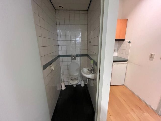 • Eerste verdieping: circa 156 m² BVO, bestaande uit een kantoorruimte van circa 52 m² BVO en een werkruimte van circa 104 m² BVO. Momenteel is het vloeroppervlak van de verdieping groter, de sparing tussen het voorgedeelte en achtergedeelte is nu middels een extra vloer dichtgelegd. Bevoorrading van de verdieping blijft mogelijk vanaf de begane grond.