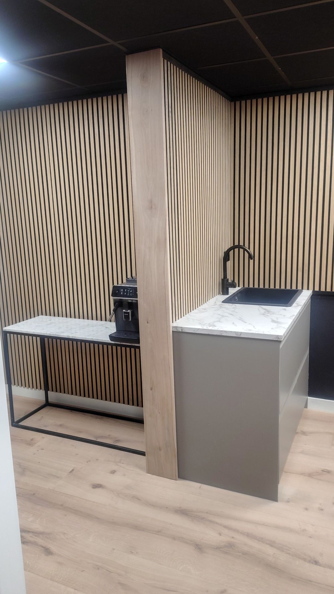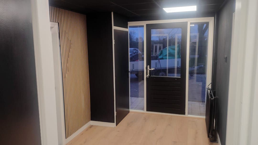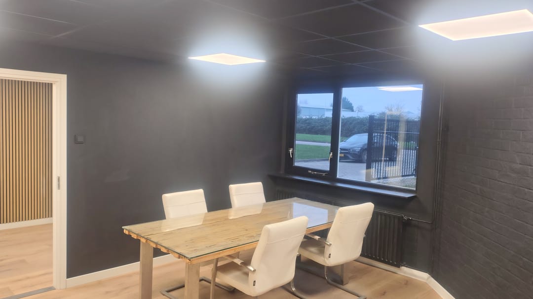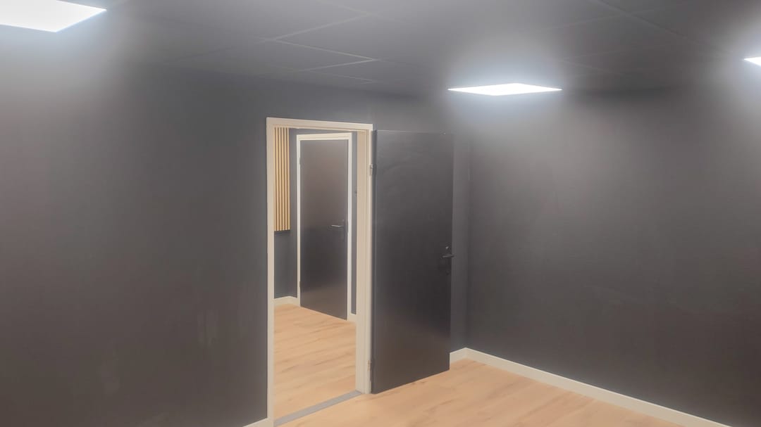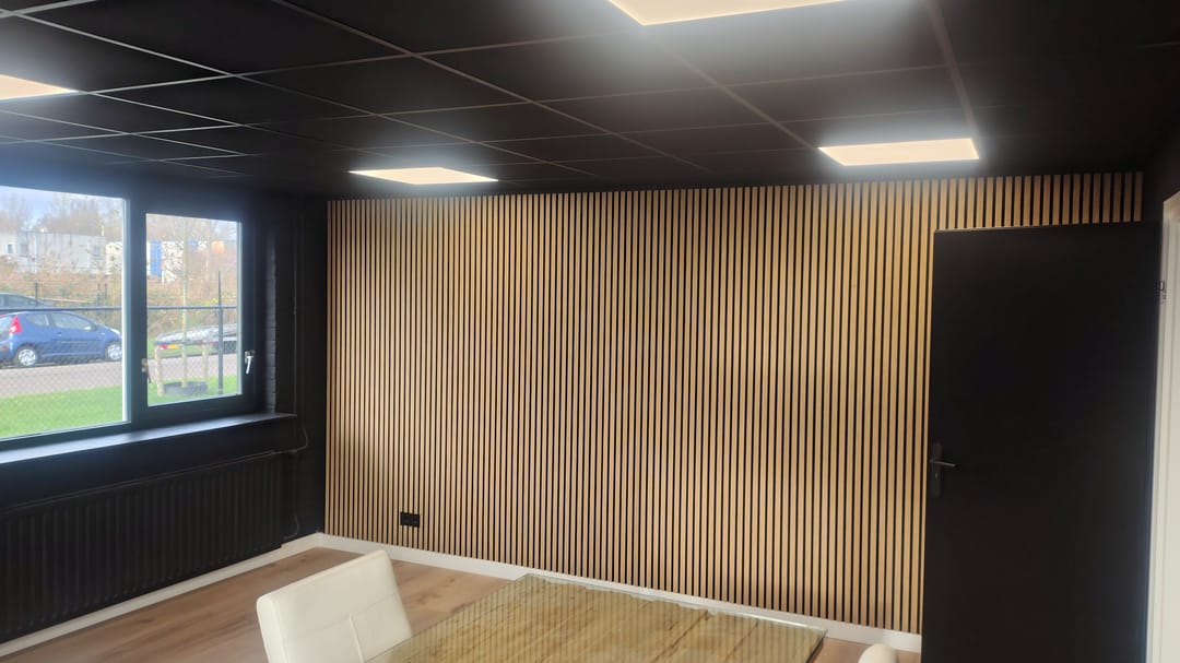 Kantoor voorzien van zwart systeemplafond, akoestische panelen en eiken parketvloer