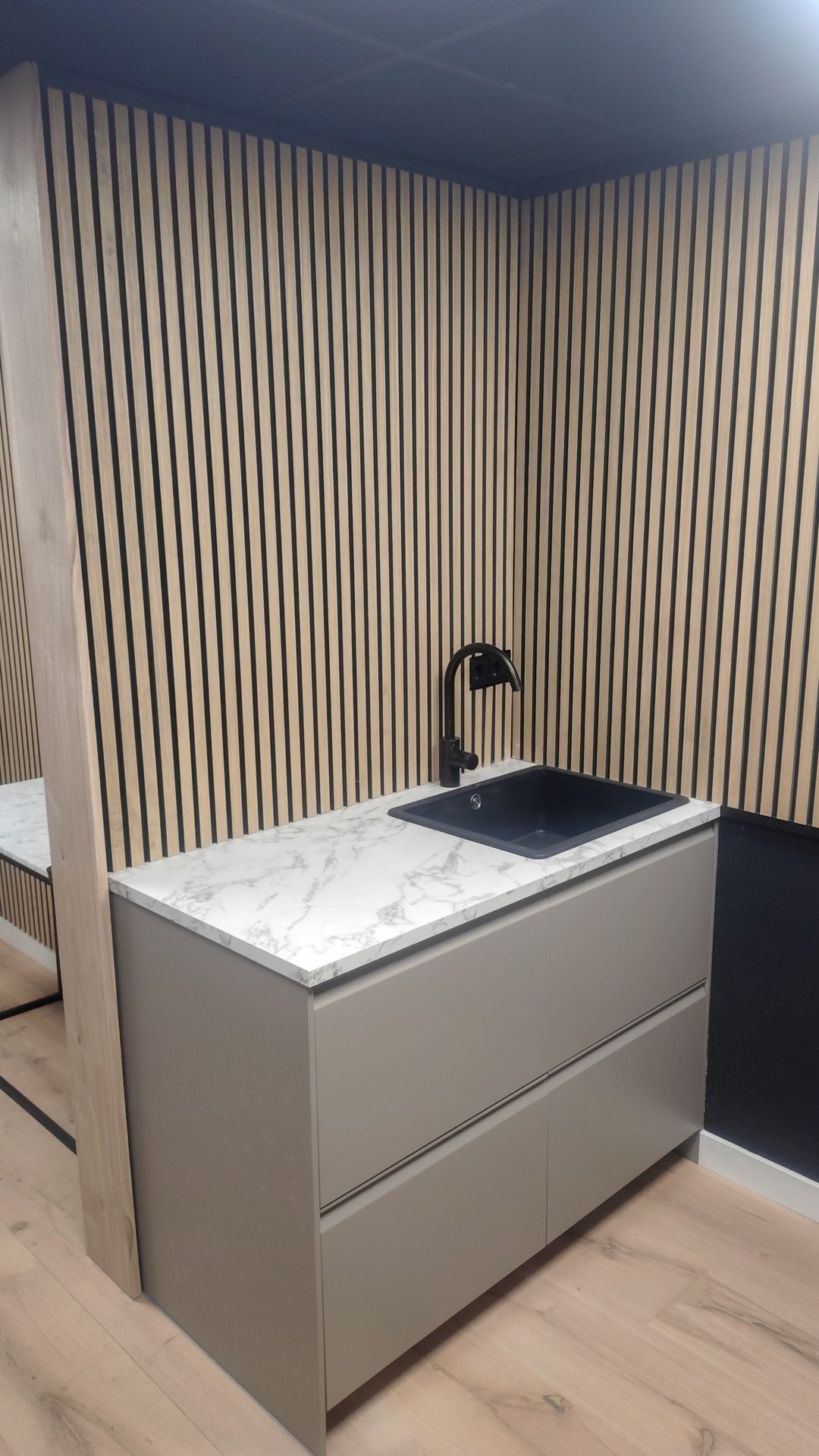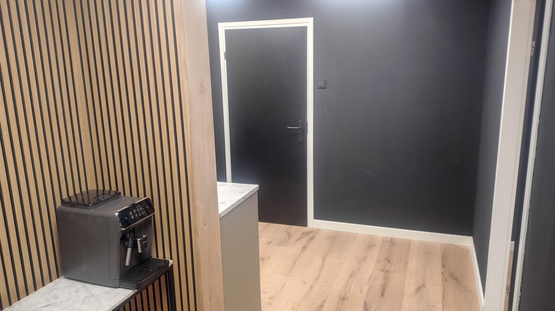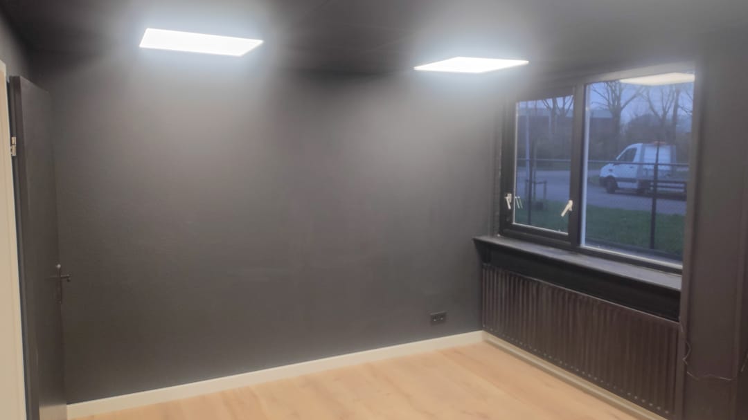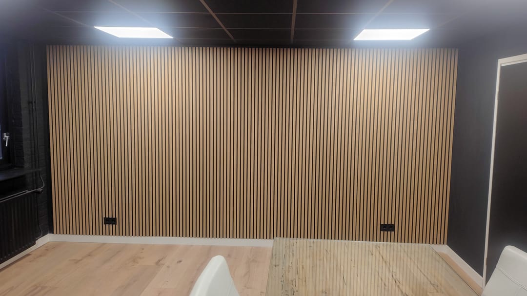 Kantoor voorzien van zwart systeemplafond, akoestische panelen en eiken parketvloer