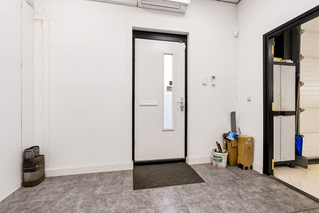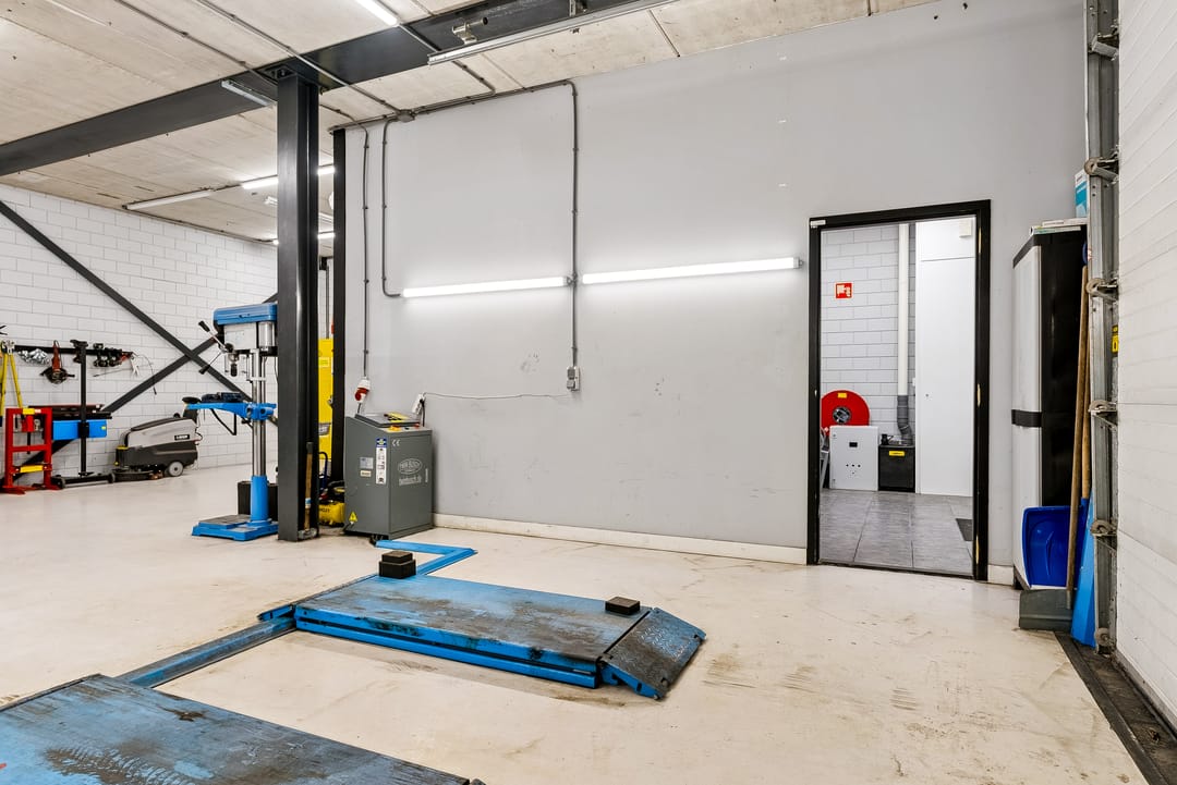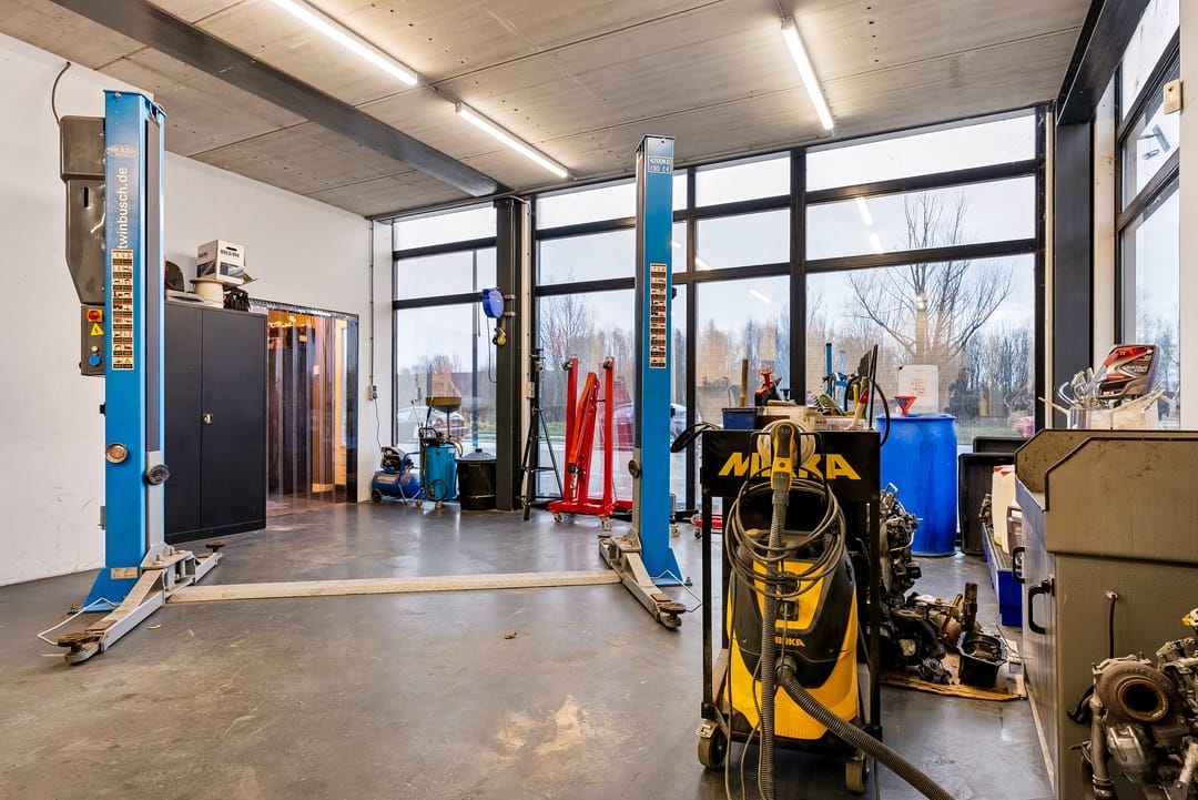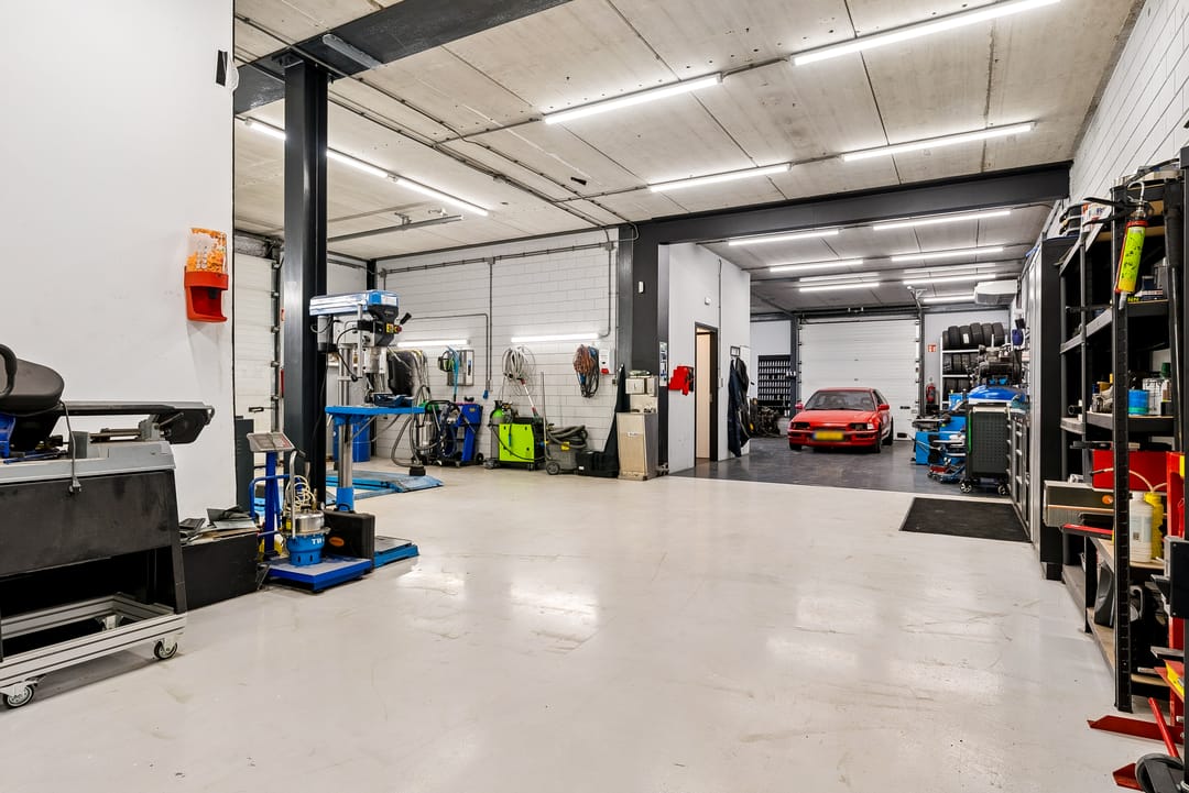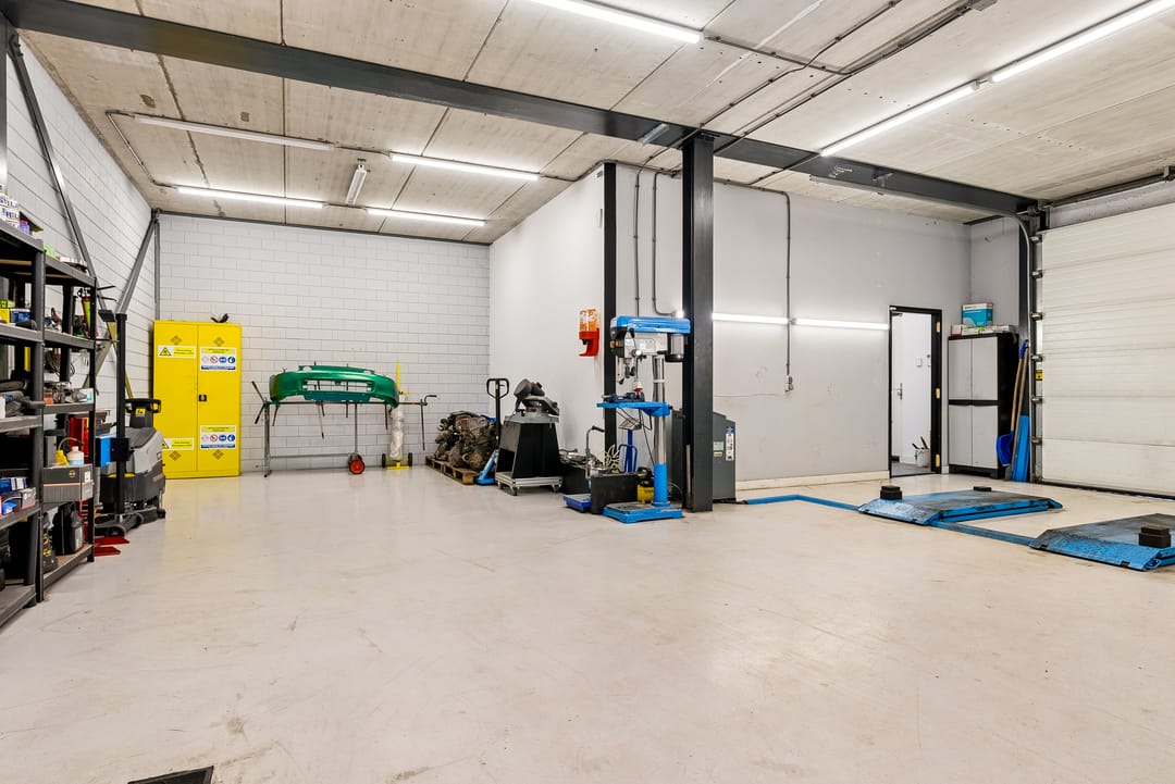 - Overheaddeuren, krachtstroom, betonvloer, toilet, pantry, airconditioning en te openen ramen
