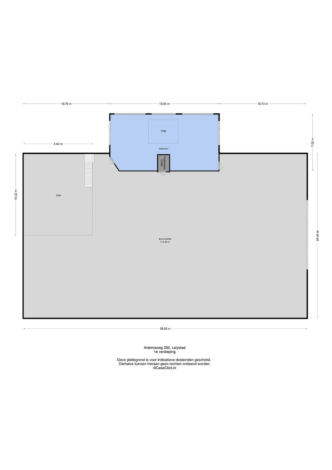 De eerste verdieping is bereikbaar via de stalen trap en heeft een bedrijfsruimte van 637m². Via de riante vide is deze bedrijfsruimte ook bereikbaar met een heftruck. Aan de voorzijde van deze verdieping treft u een onbenoemde ruimte met enorm veel daglicht toetreding en bijna volledig geïsoleerd is, welke kan dienen als kantoorruimte of kantine met speelse vide. Hier treft u tevens aan de achterzijde de technische ruimte aan. Deze mooie locatie, met dit pand, is ideale combinatie voor uw bedrijfsactiviteiten!