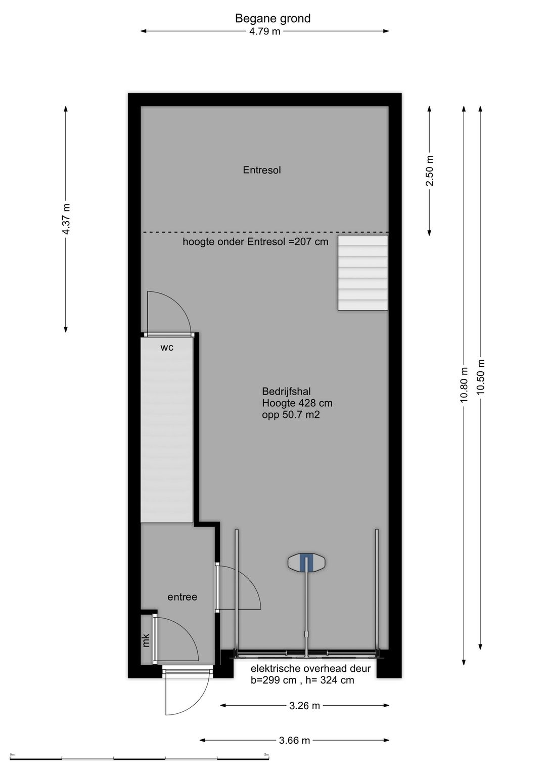 - Vrije hoogte: 7 meter (onder entresol 3,5 meter)