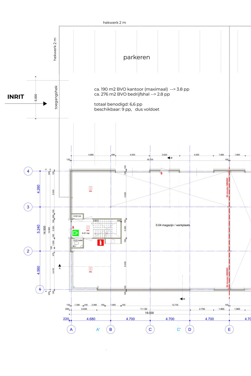 De vloeroppervlakte van het pand bedraagt 466 m², verdeeld over de begane grond (276 m² bedrijfsruimte) en de bovenverdieping (kantoorruimte 190 m²).