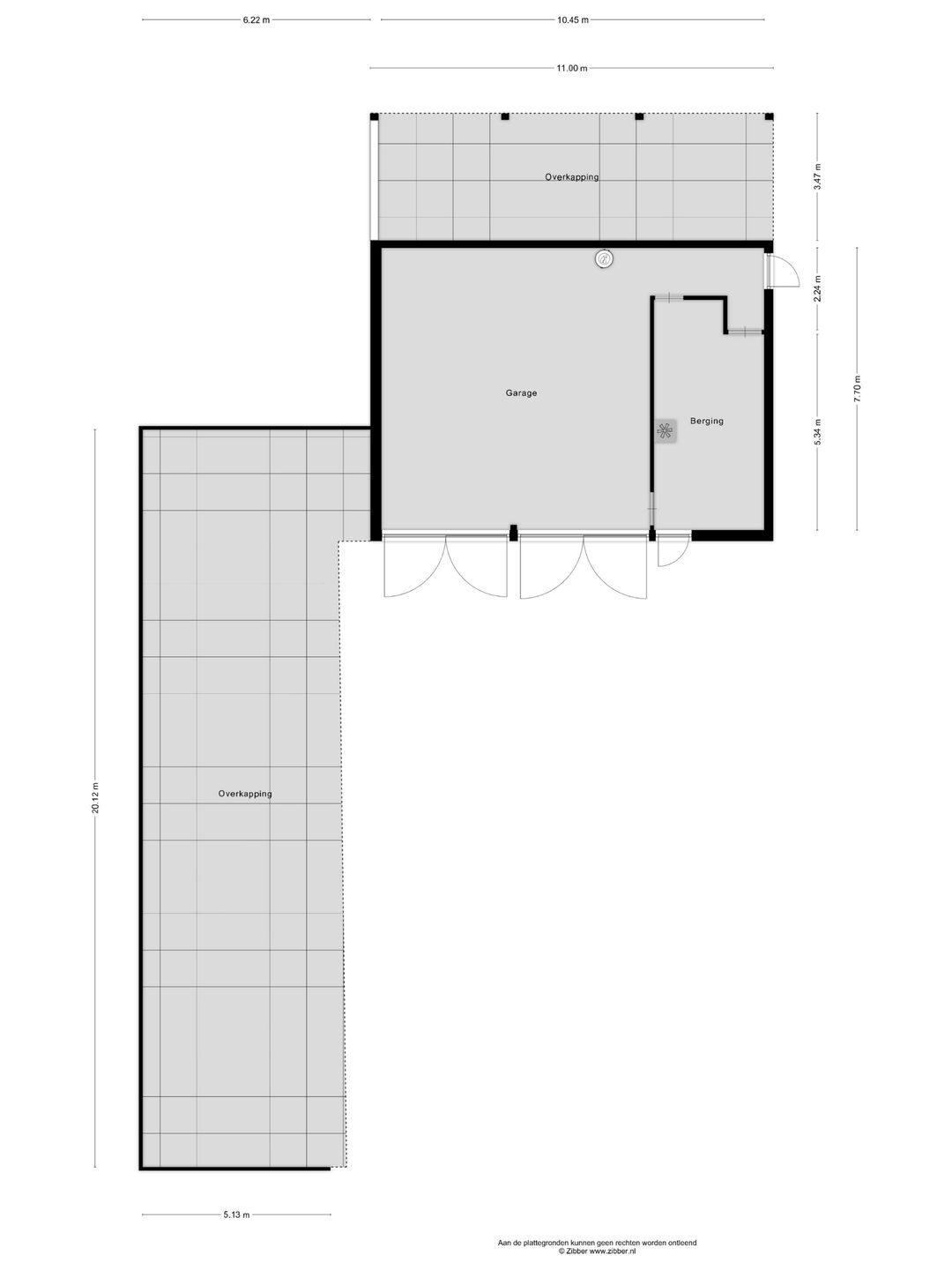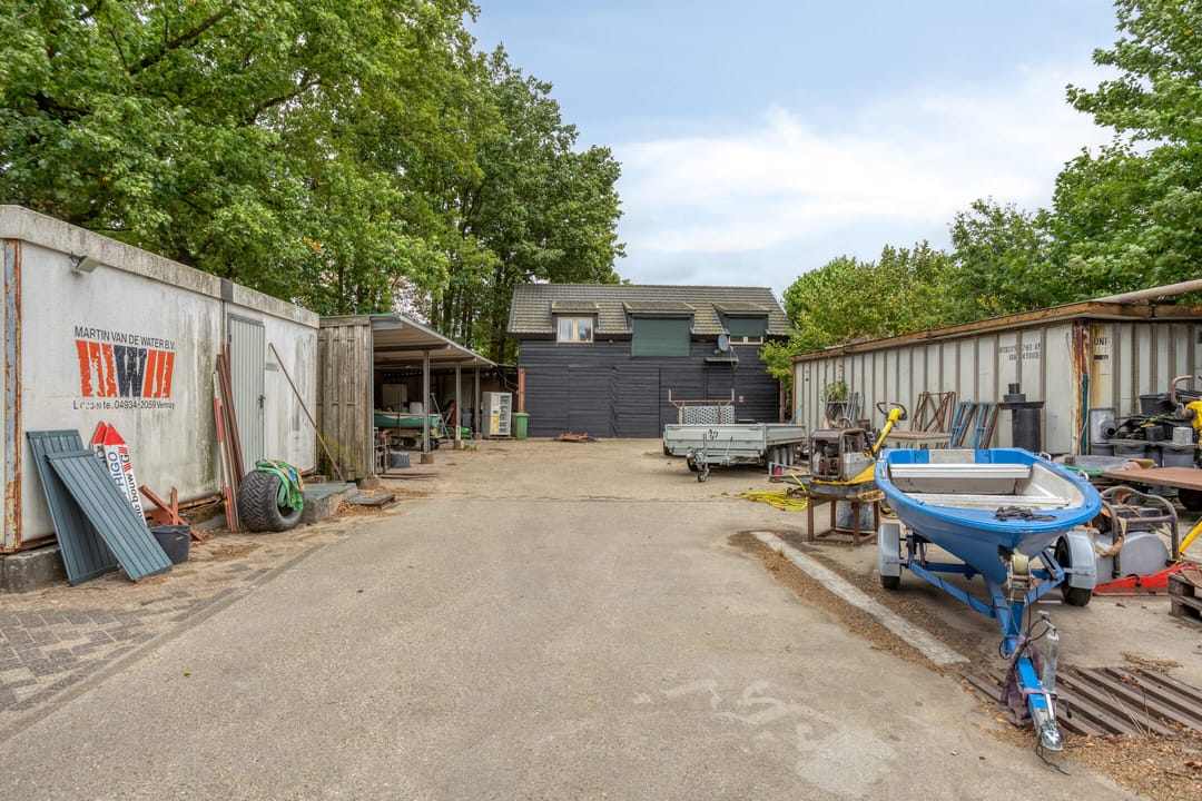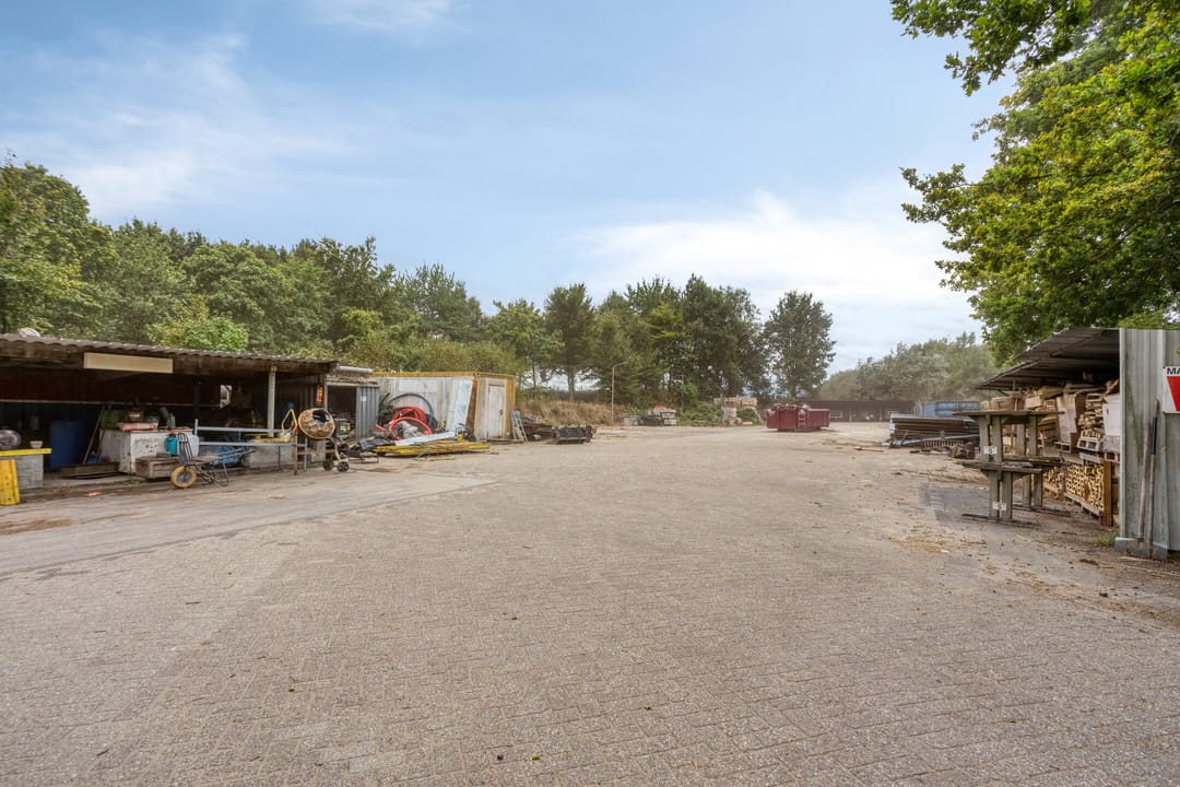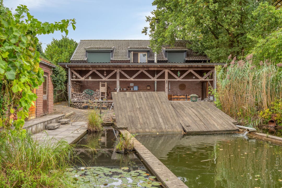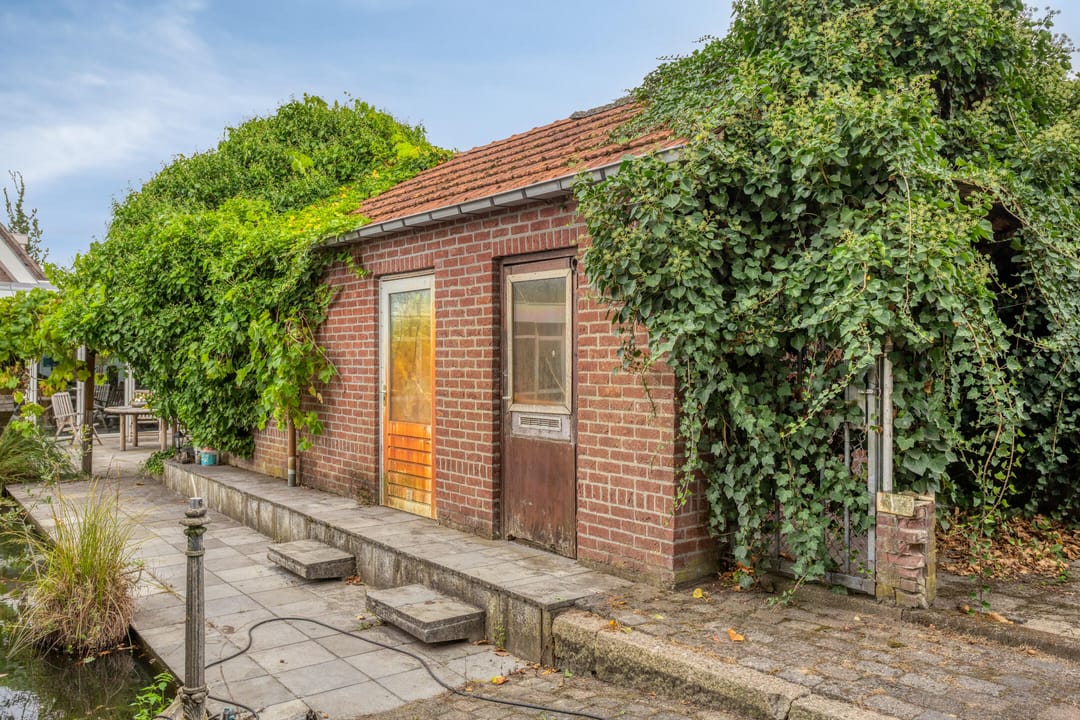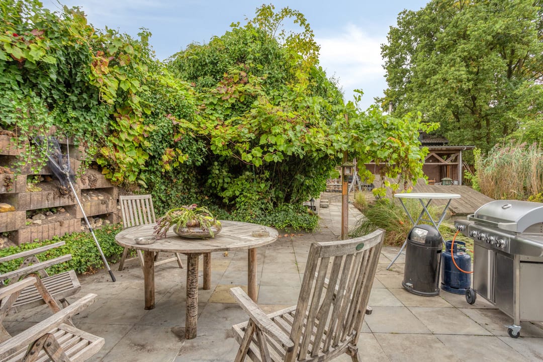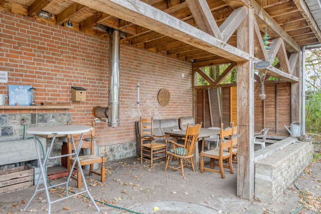Op het perceel bevindt zich verder een vrijstaande garage, opgetrokken in metselwerk (voorzijde) en voorzien van een schuin dak met drie dakkapellen. Daarnaast beschikt de tuin over een buitenterrein met betonklinkers, een overkapping met stalen gerenoveerde dakplaten en een tweede, oudere overkapping. In een van de bijgebouwen bevindt zich bovendien een stalen overspanning, waardoor extra gebruiksmogelijkheden ontstaan.