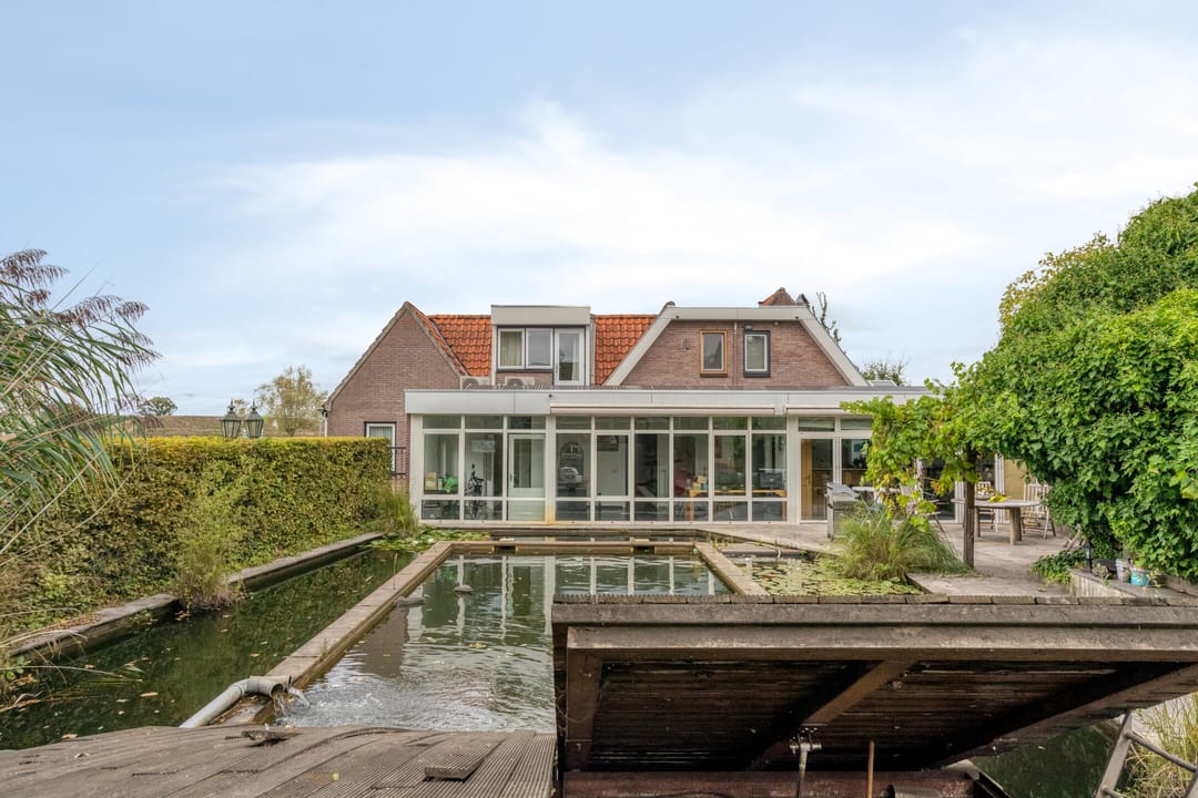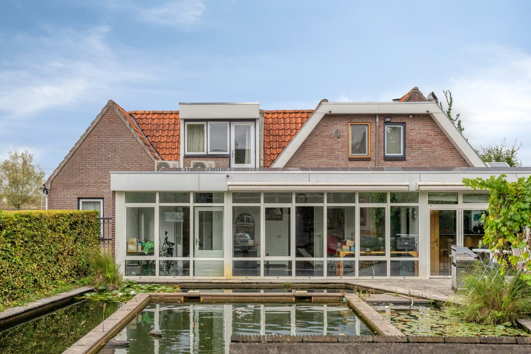 De achtertuin, gelegen op het zuiden, is verzorgd aangelegd met onder meer een ruime vijver en diverse zitgelegenheden.