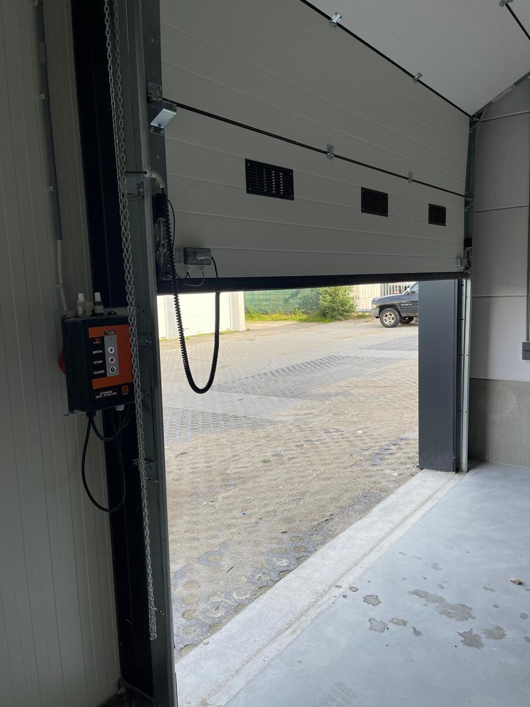 - Elektrisch bedienbare garagedeur met een hoogte van 3 meter.
