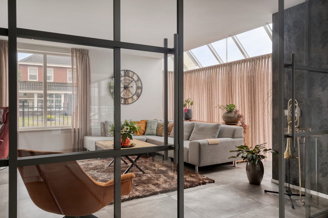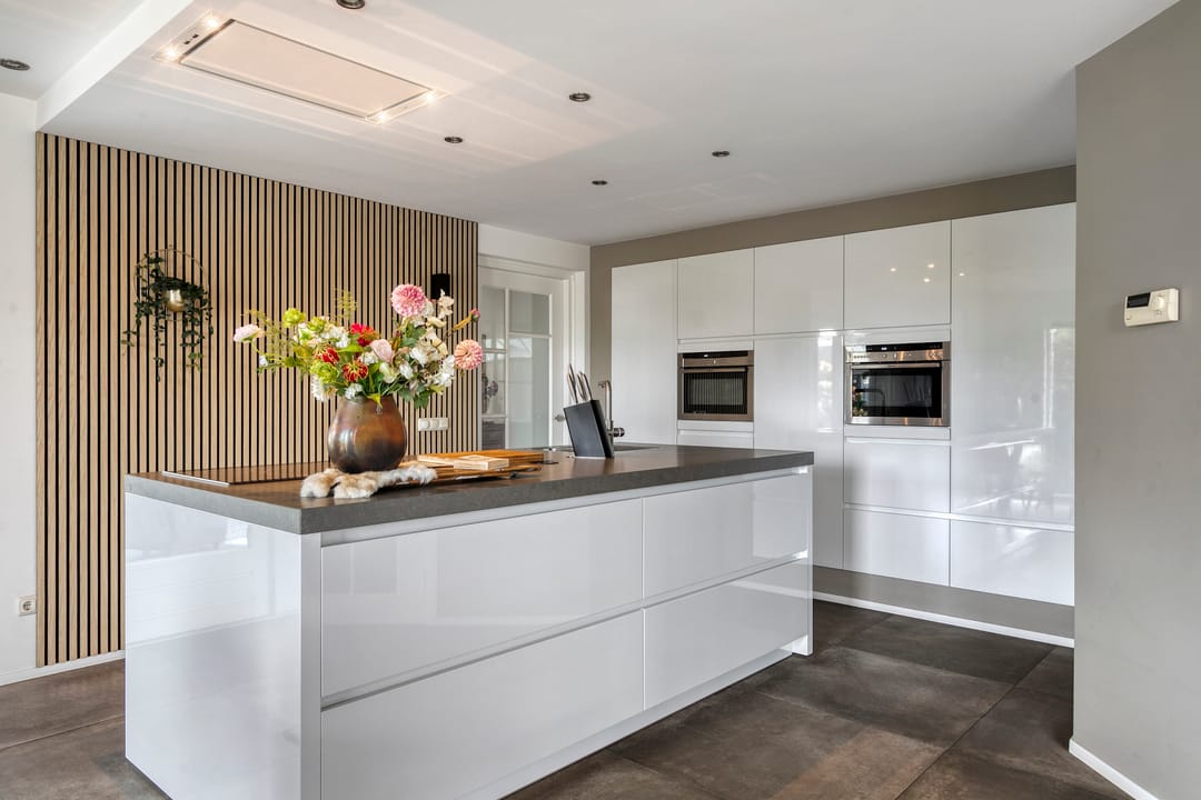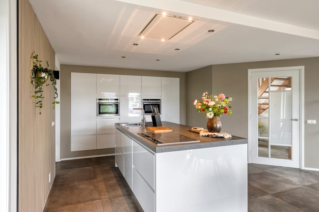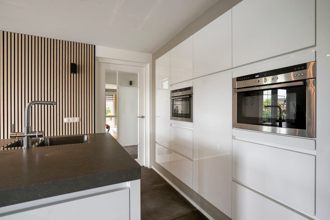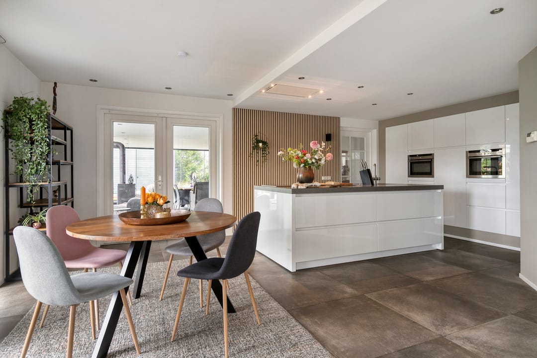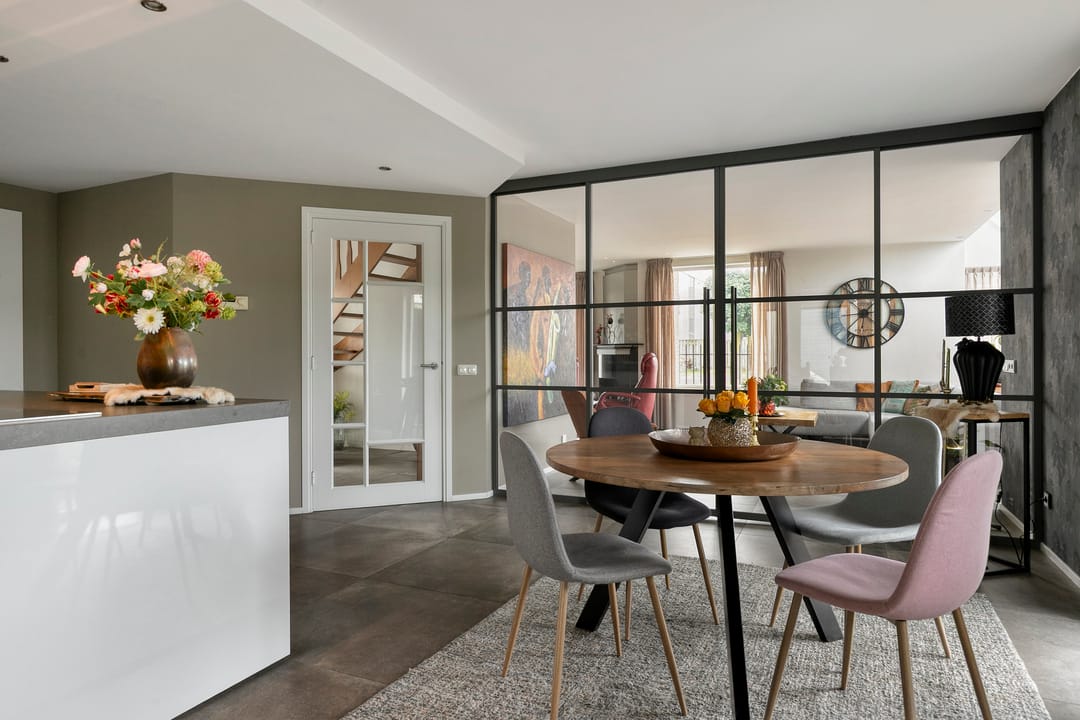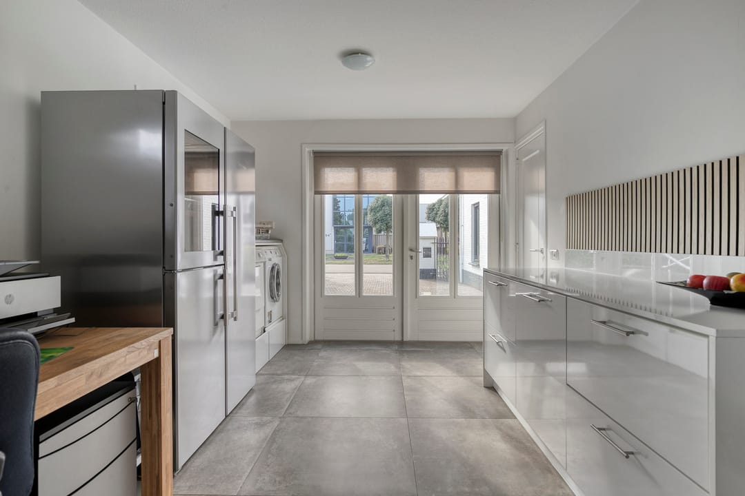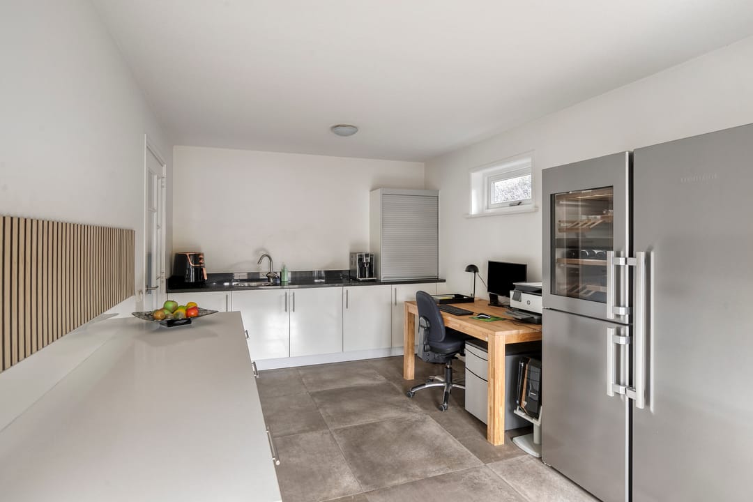 - De luxe keuken (2020) heeft een moderne uitstraling, is van alle gemakken voorzien en biedt ruimte voor een grote eetkamertafel. De ruimte is af te sluiten door de stijlvolle stalen ensuite-deuren, geplaatst in 2024.