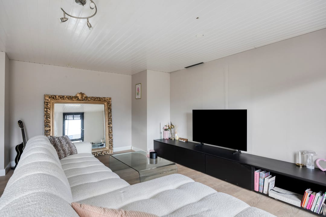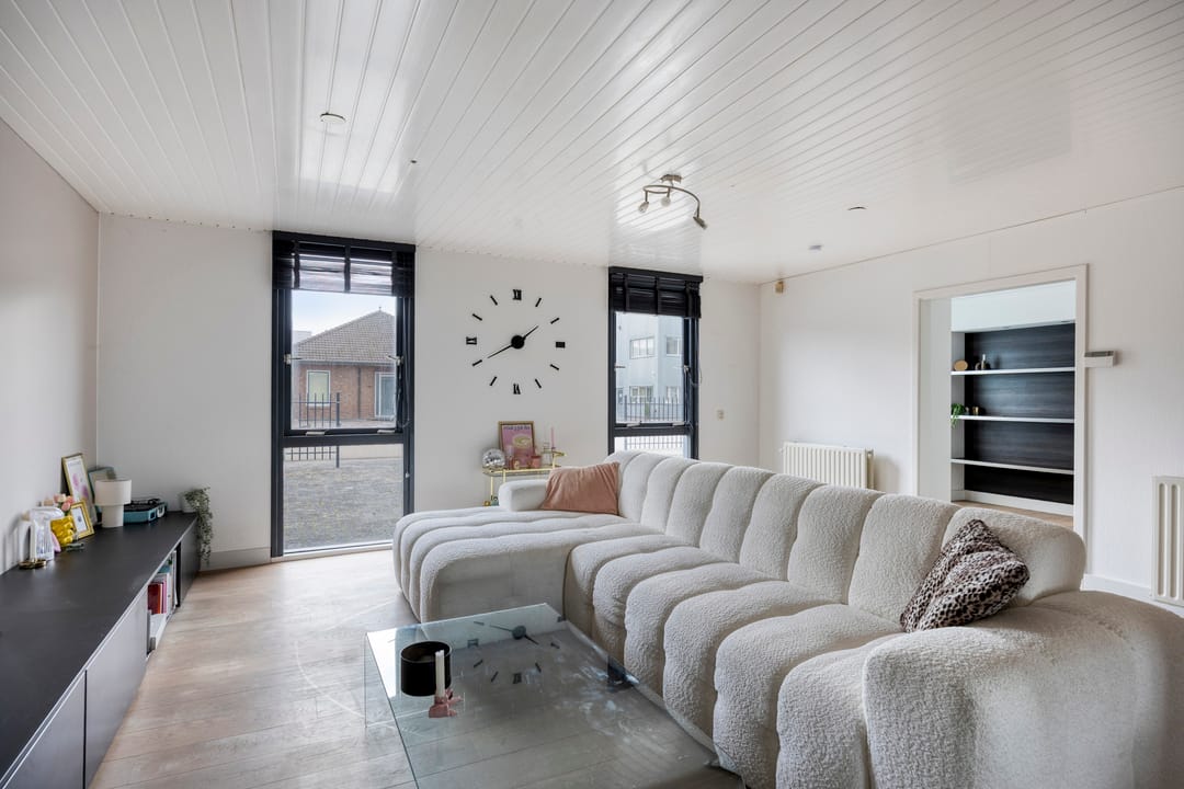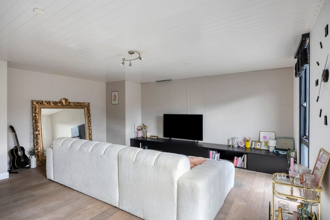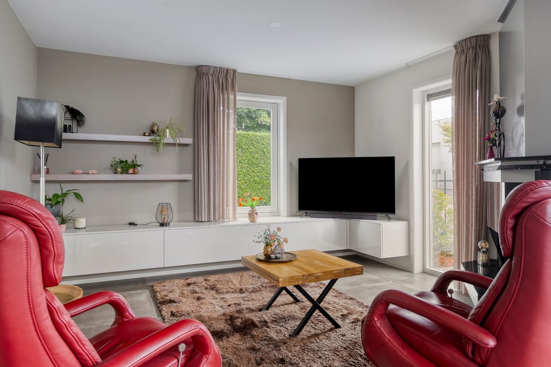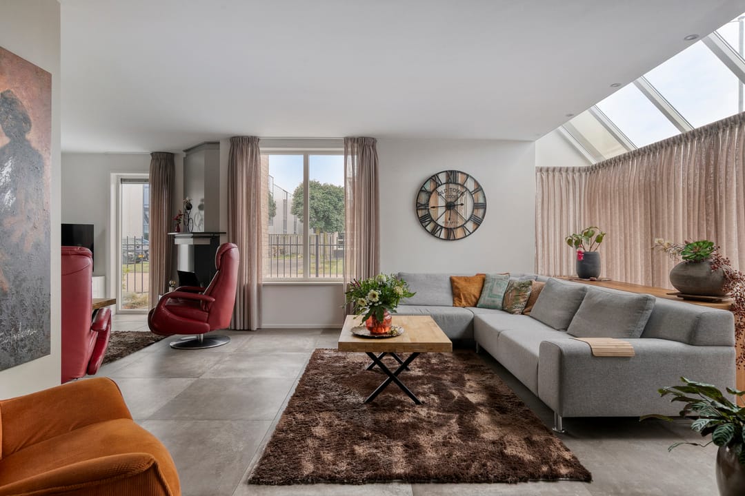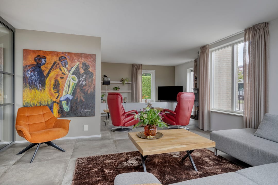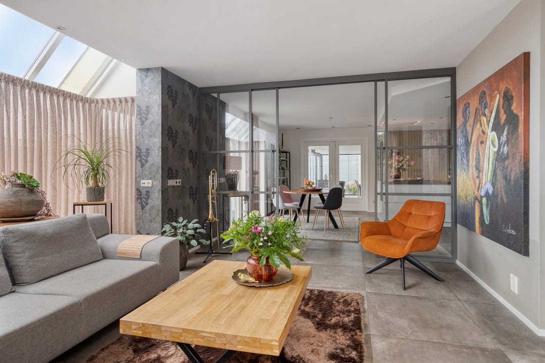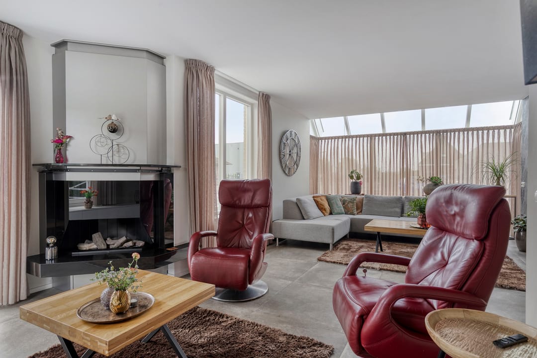 - De woonkamer is in lichte kleurstelling afgewerkt, voorzien van een moderne plavuizenvloer met vloerverwarming, strak gestuukte wanden en plafonds. De woonkamer heeft veel daglicht toetreding door de aanwezigheid van grote raampartijen en de serre. Tevens bevindt zich hier een sfeervolle gaskachel.