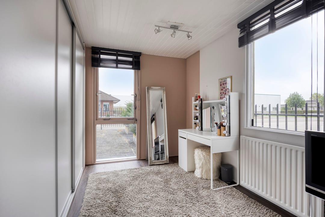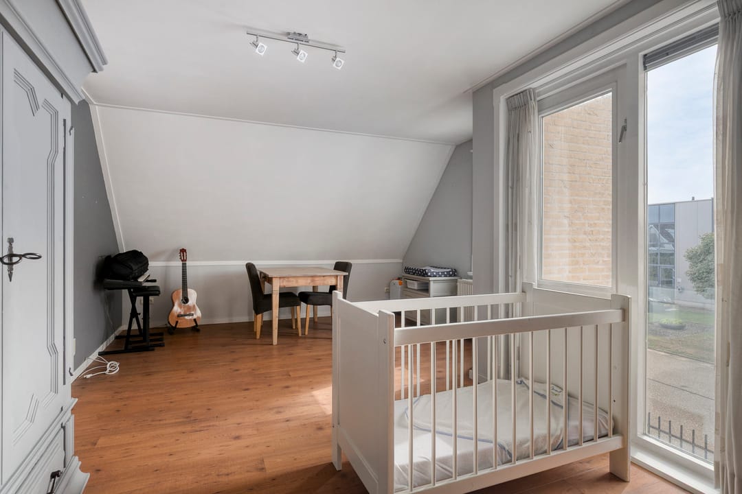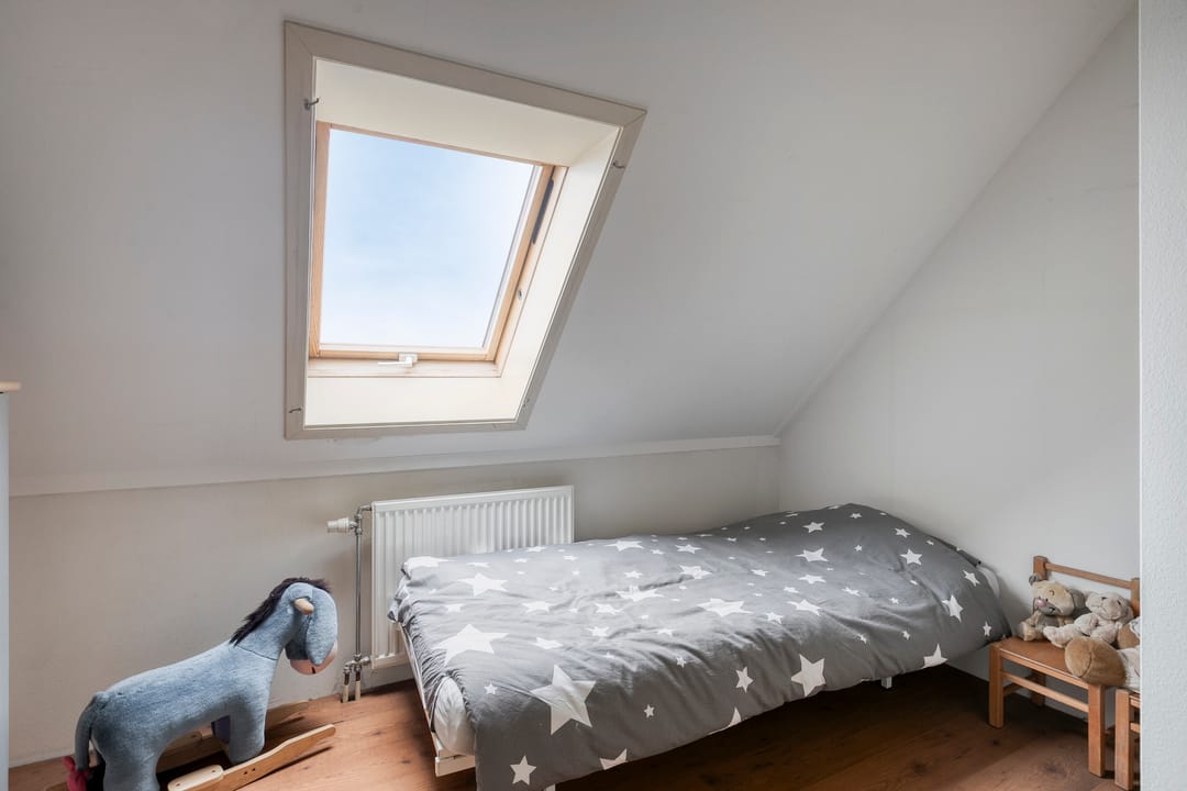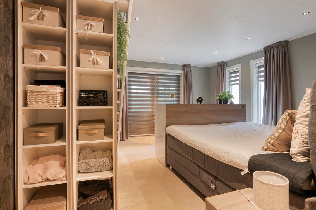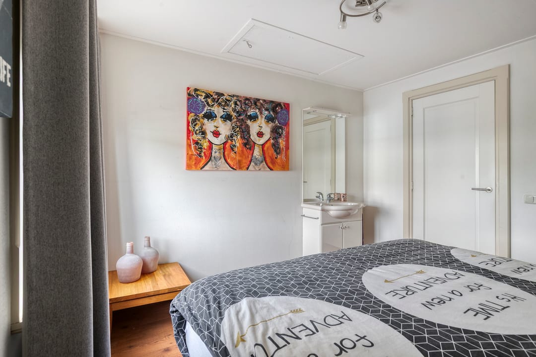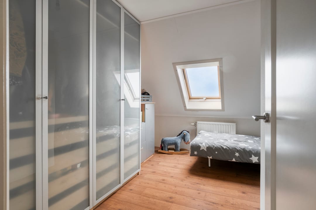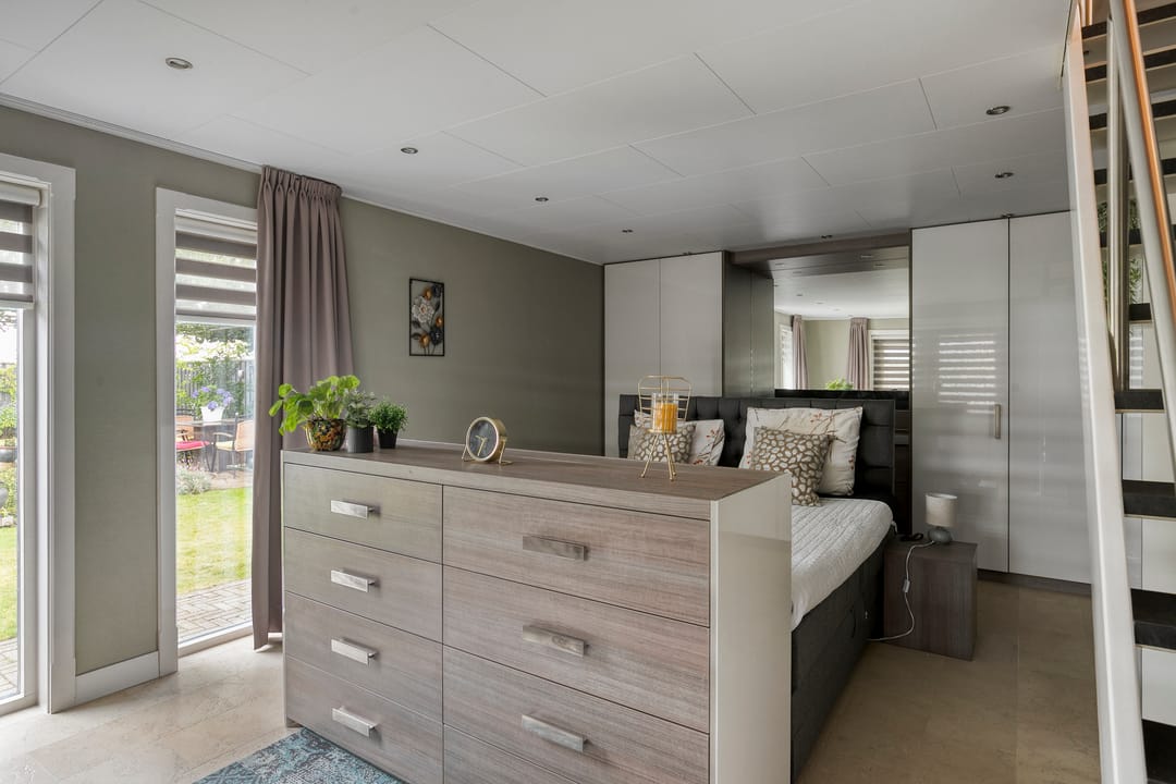- Op de begane grond bevindt zich tevens een extra (slaap)kamer. De ‘master’ is voorzien van een vaste kastenwand met wastafelmeubel. Momenteel is deze ruimte in gebruik als slaapkamer, maar is natuurlijk ook eenvoudig te benutten als speelkamer, kantoor, etc.