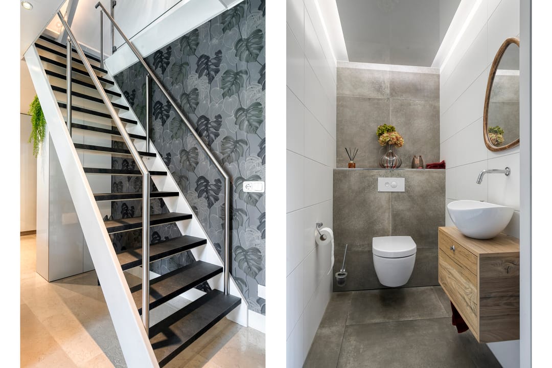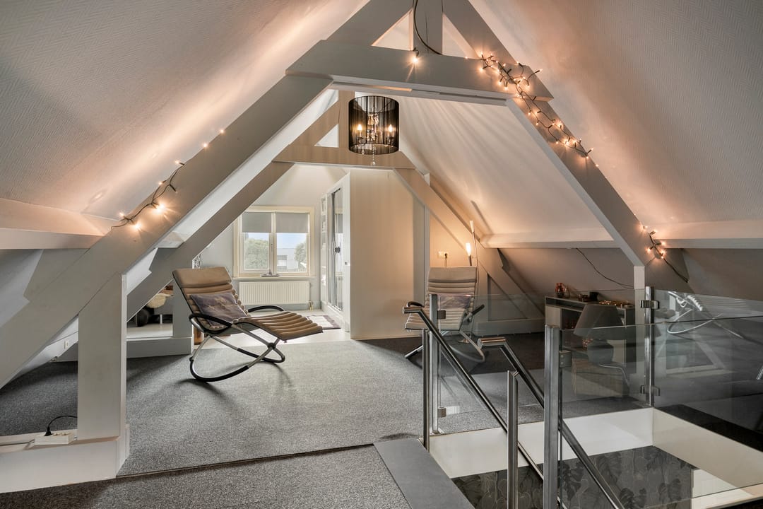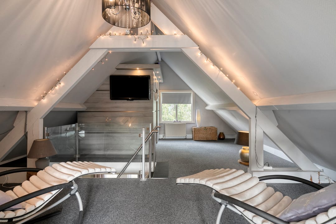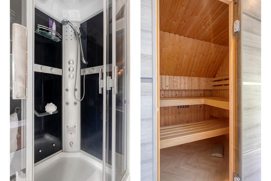 - Via de stijlvolle vaste trap kom je in de wellness-ruimte, voorzien van onder andere een 4-persoons traditionele Finse sauna en stoom-/douchecabine.