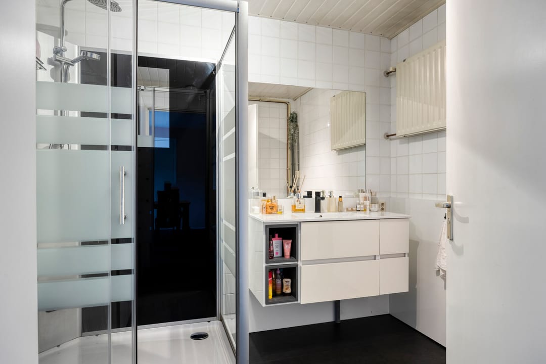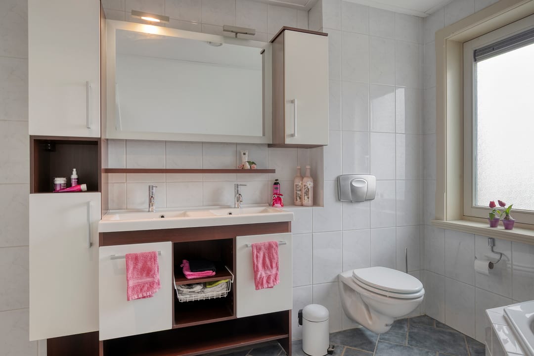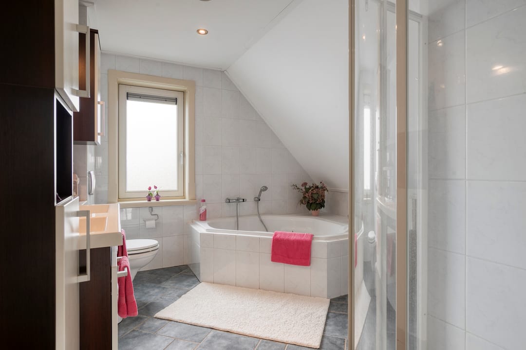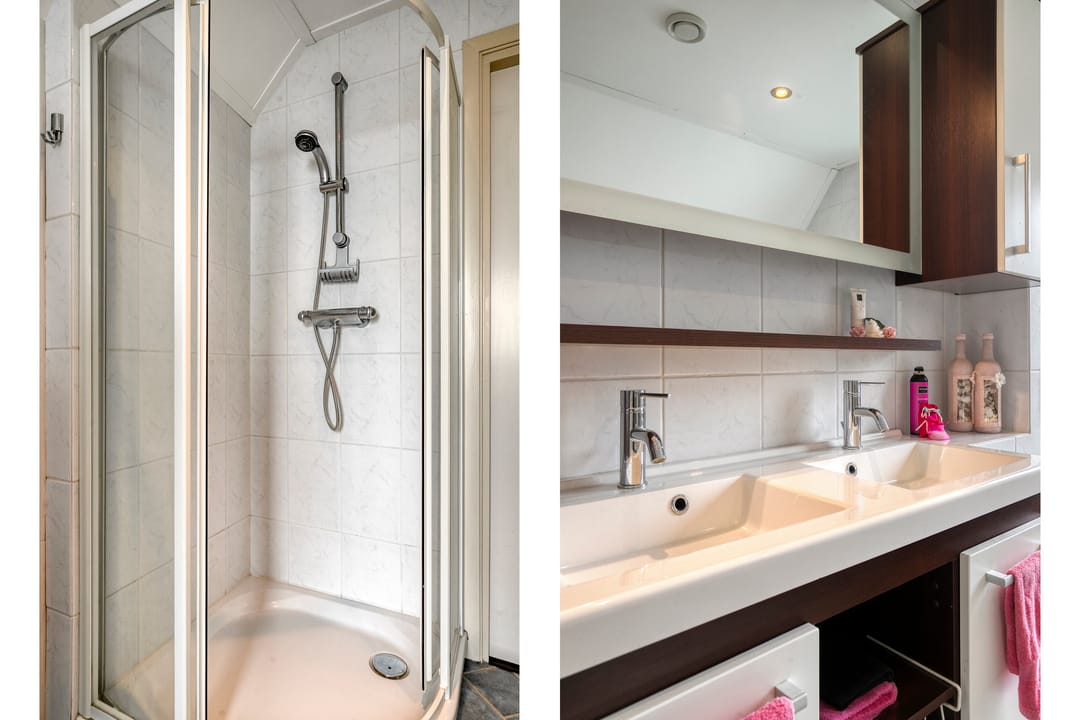 - 1e verdieping met overloop, 3 slaapkamers en moderne badkamer voorzien van douche, dubbele wastafel, ligbad en toilet.