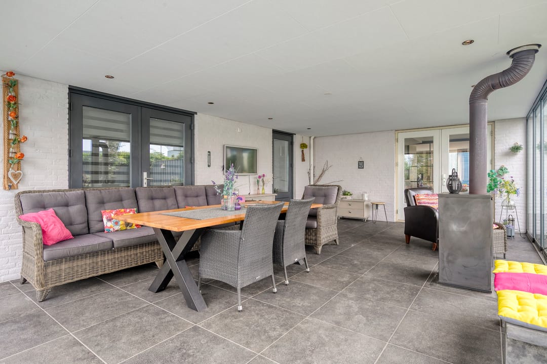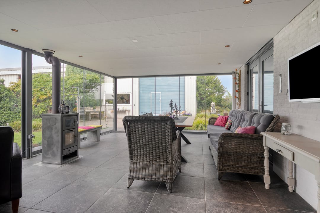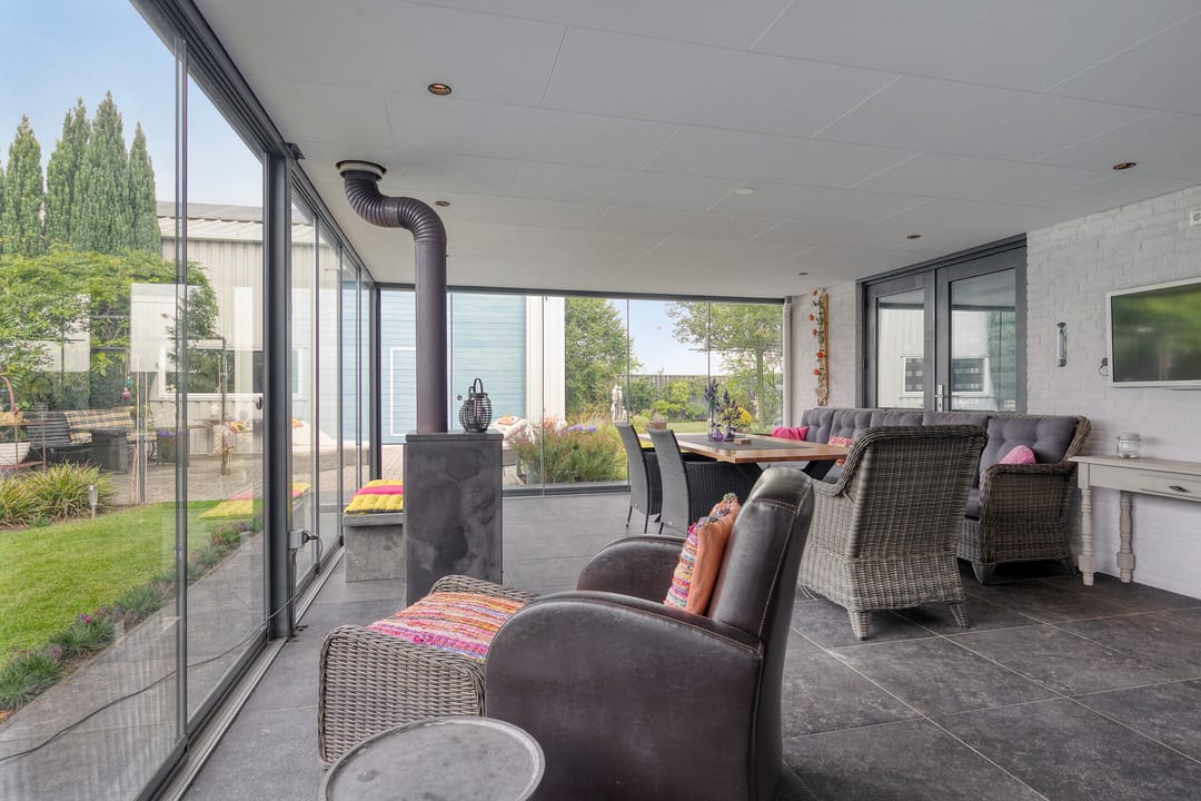 - Middels de tuindeuren vanuit de woonkamer én via de hal is het volledig met glazen wanden af te sluiten, sfeervolle tuinkamer te betreden. De tuinkamer kan worden verwarmd middels een houtkachel.