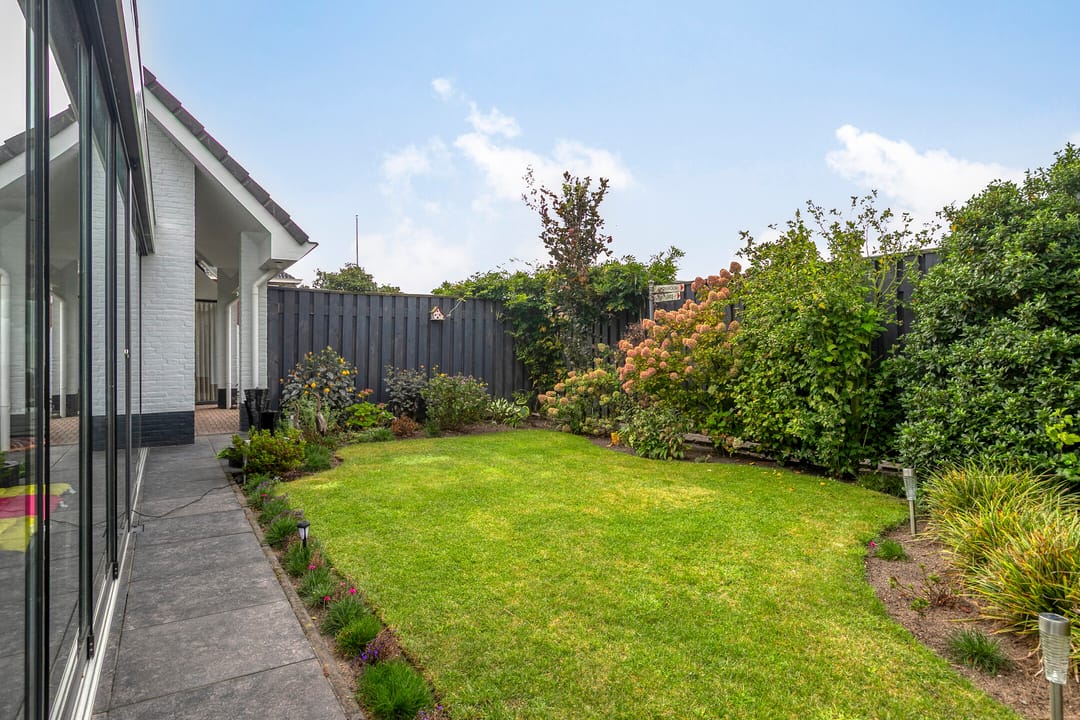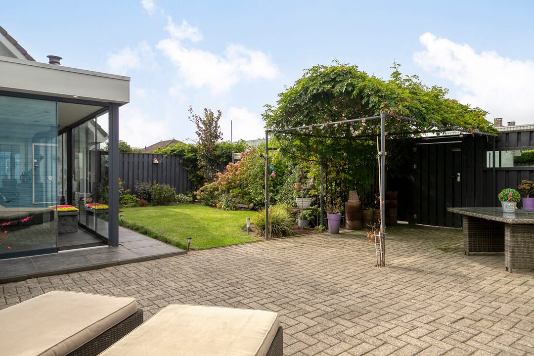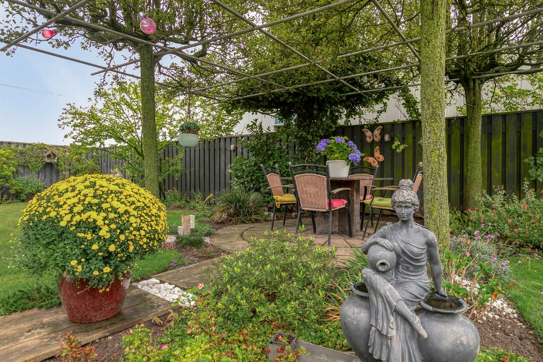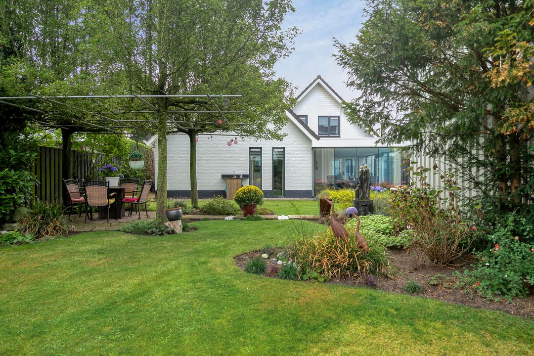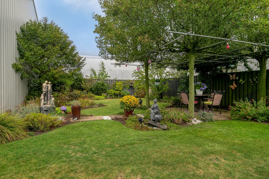 - Organisch aangelegde achtertuin, (overdekt) terras, gazon, borders, sierbeplanting en een smeedijzeren sierhekwerk.