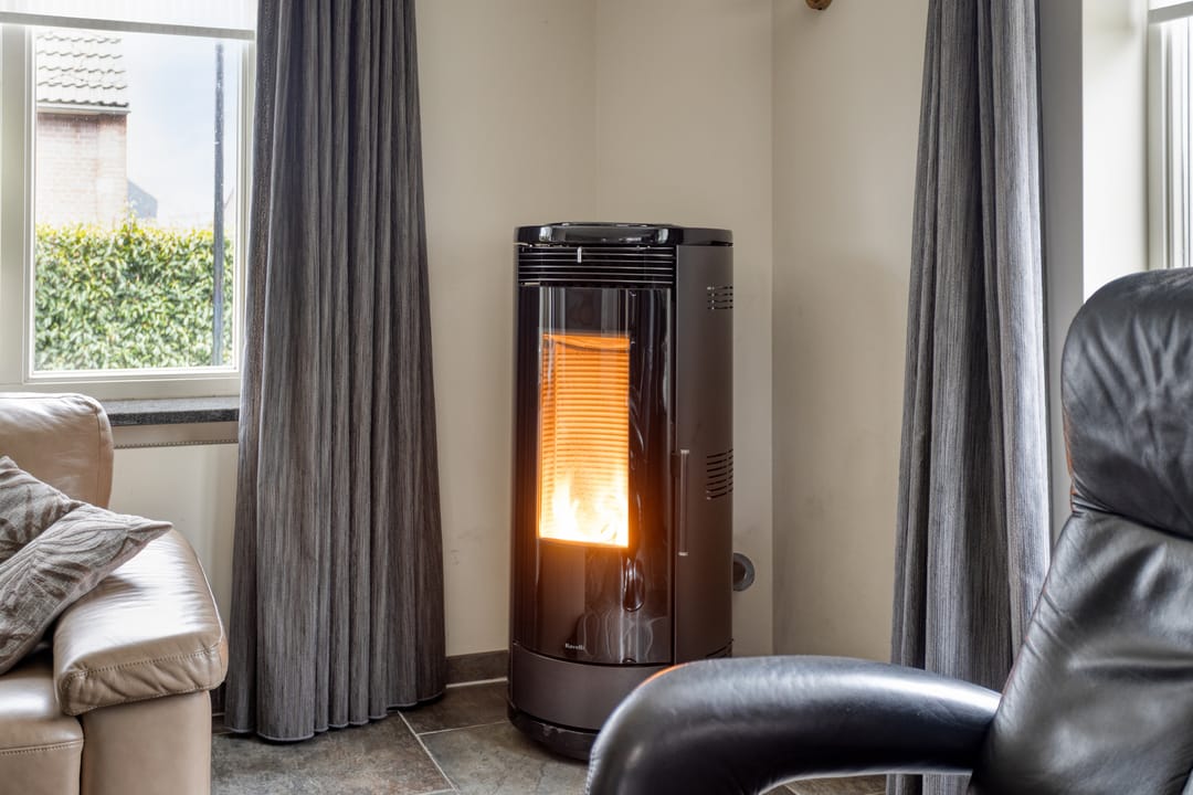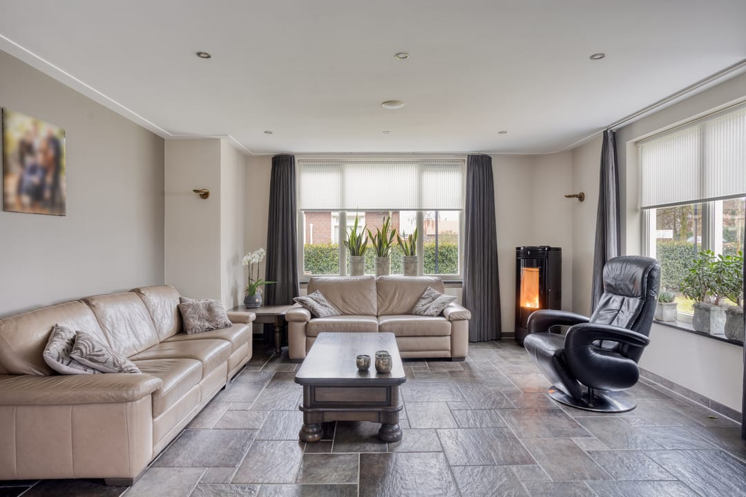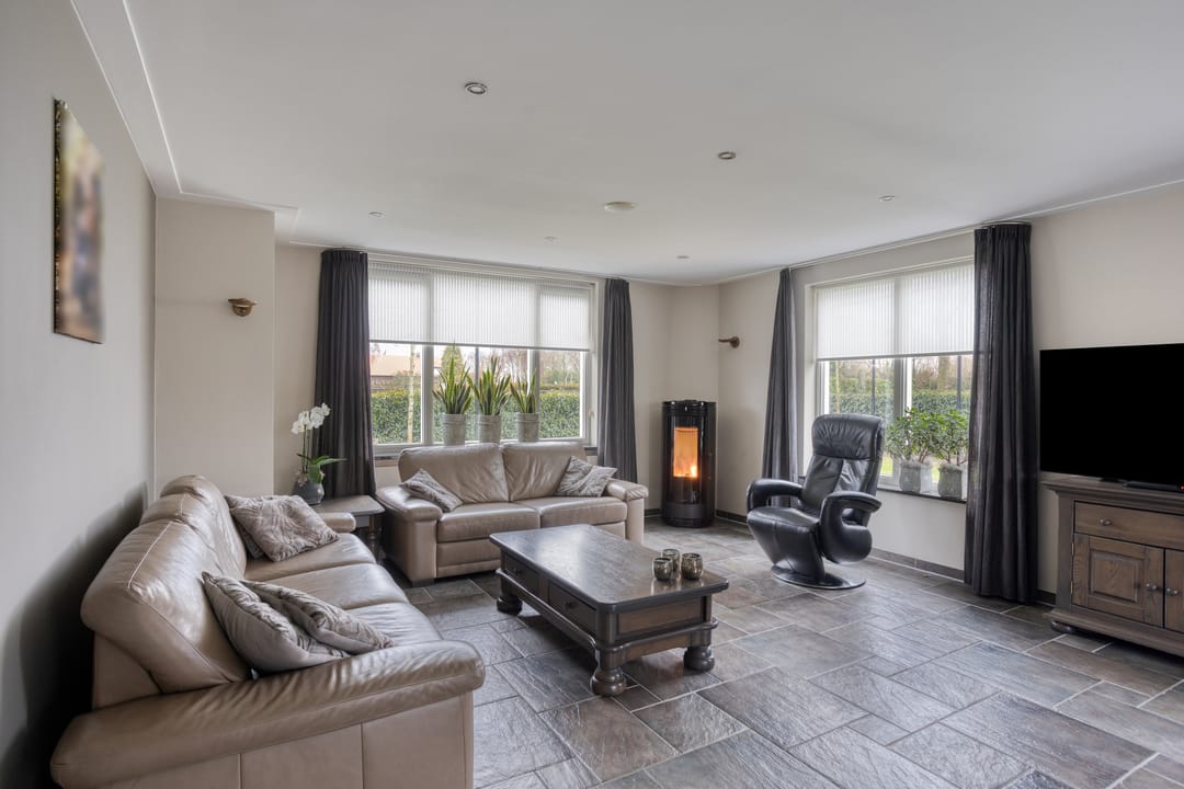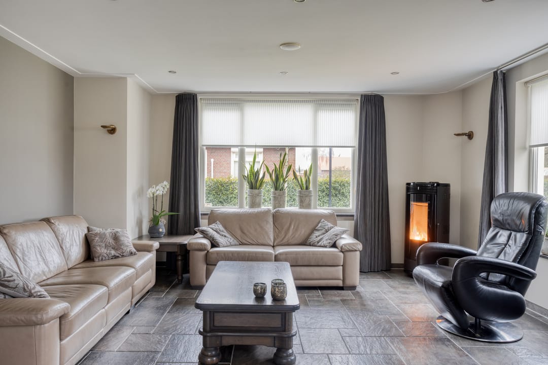 Aan de voorzijde van de woning bevindt zich de woonkamer. Het daglicht valt breed naar binnen door de vele raampartijen aan zowel de voorzijde als de zijkant van de woonkamer. Een pelletkachel zorgt voor extra warmte en sfeer tijdens de koude wintermaanden.