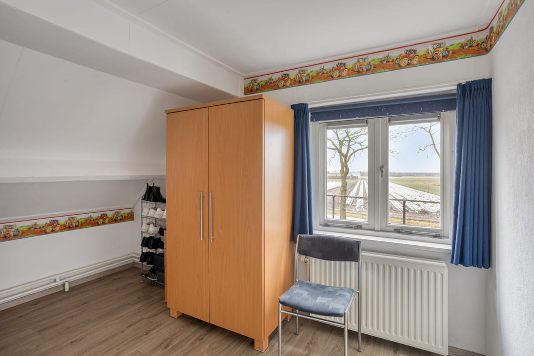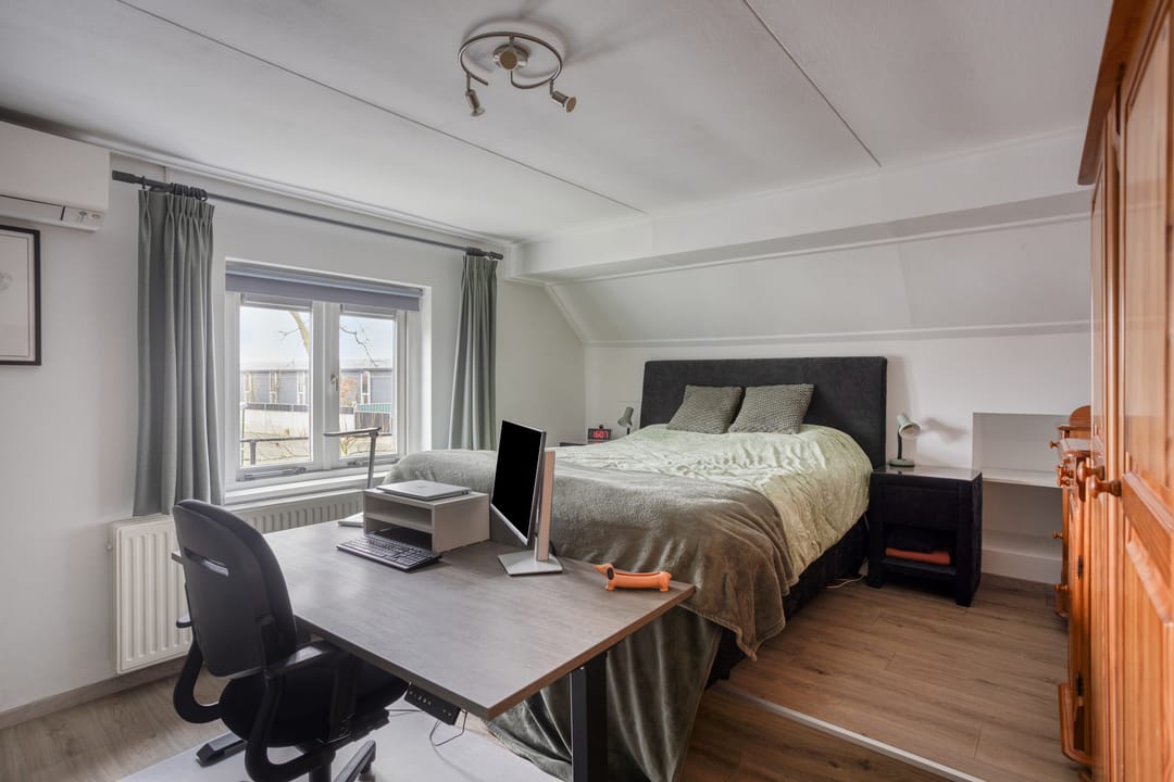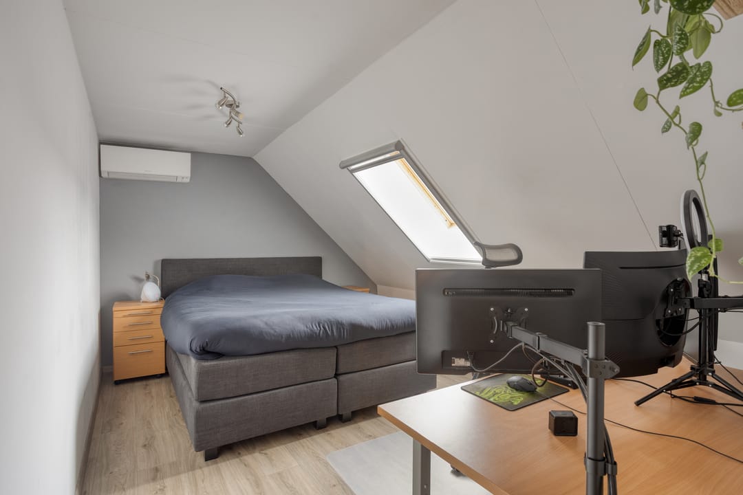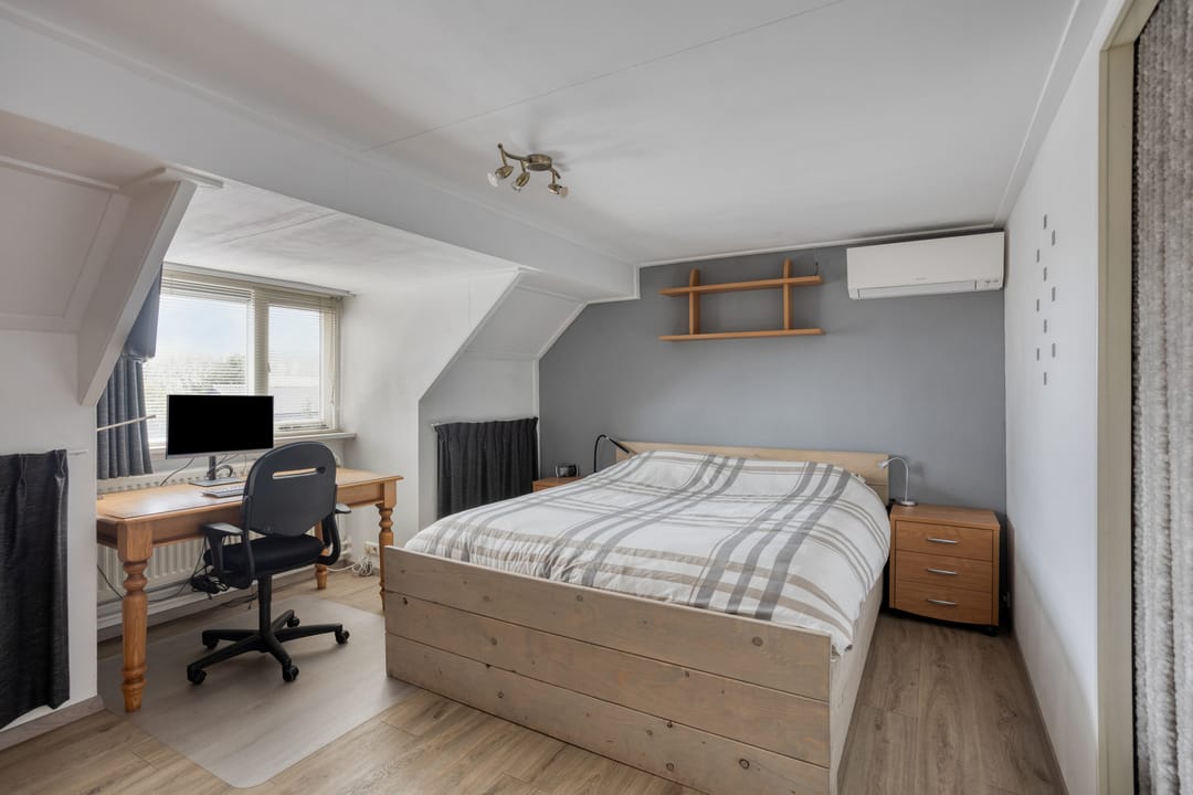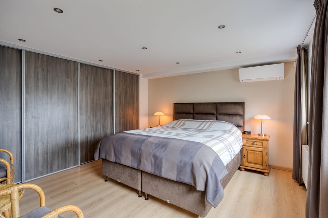Vanuit de badkamer is de slaapkamer te bereiken welke zich aan de achterzijde van de woning bevindt. Deze slaapkamer heeft de beschikking over een airco, waardoor het tijdens de warme zomermaanden en de koude wintermaanden behaaglijk blijft en een praktische vaste kast.