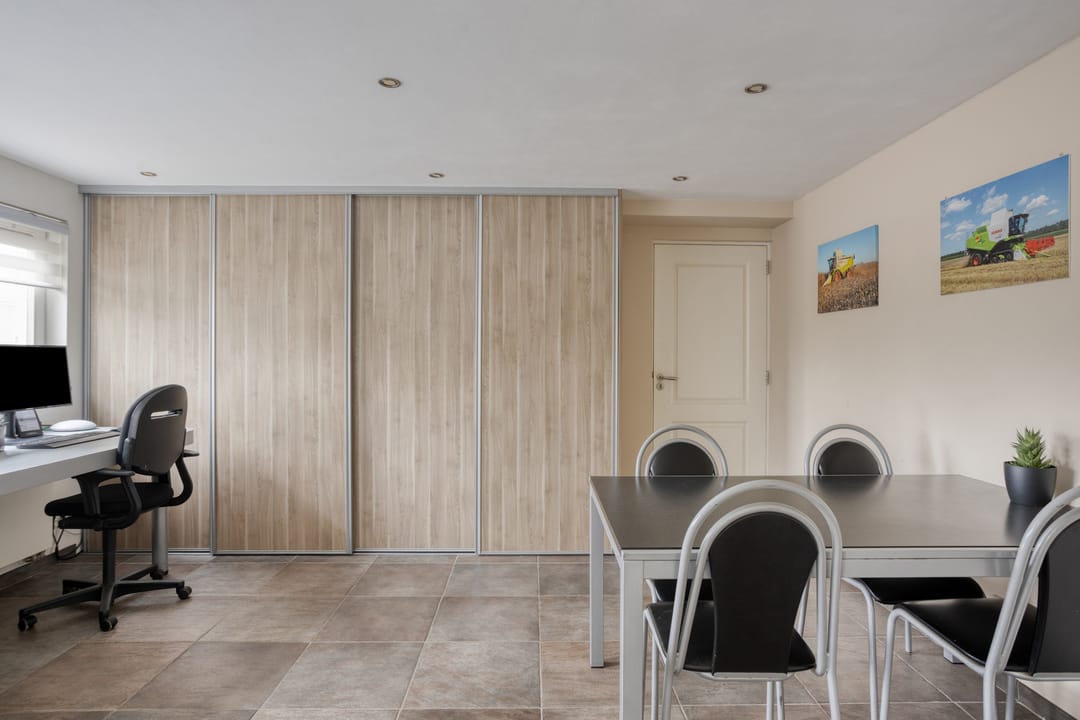 Aan de achterzijde van de woning, naast de bijkeuken bevindt zich een kantoorruimte met kastenwand, een ruim bureaublad met vaste (koffie)kast in dezelfde stijl. Ook deze ruimte heeft de beschikking over een airco (verwarmen en koelen).