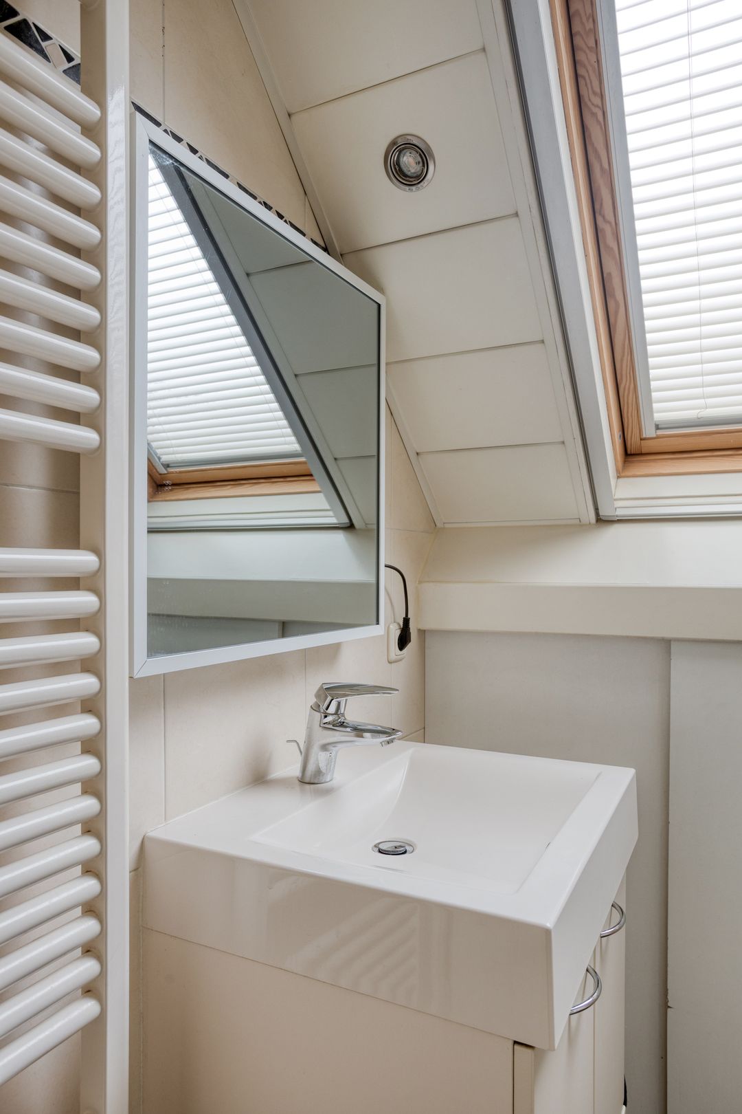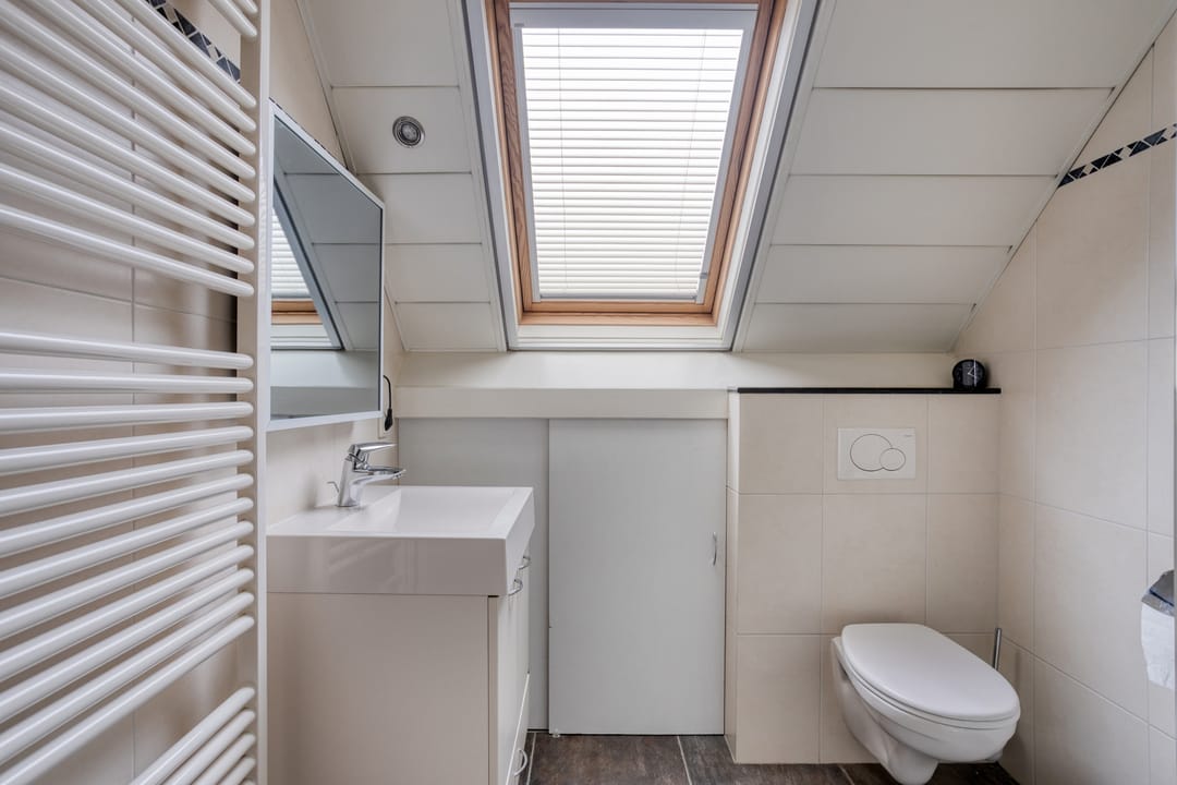 De badkamer is ingericht met een ligbad, een wastafel in een meubel, een ruime inloopdouche en een toilet. Een raam zorgt voor de natuurlijke lichtinval en natuurlijke ventilatie naast de mechanische ventilatie. Tevens is er een airco (verwarmen en koelen) aanwezig in de badkamer.