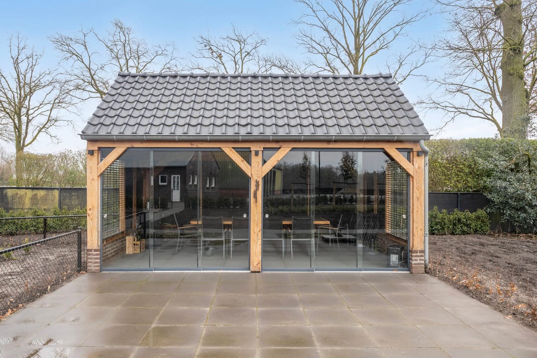 Het tuinhuis (oppervlakte: 5,96 x 3,50 = 21 ² binnenwerks) is gebouwd in 2020 en is opgetrokken uit steen en hout. Het dak is met pannen gedekt. In het tuinhuis is een tegelvloer aanwezig en is via een glazen schuifwand bereikbaar. Daarnaast is het tuinhuis voorzien van zinken goten.