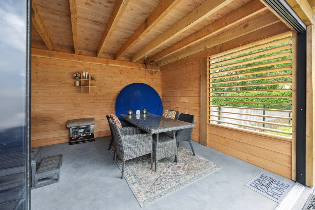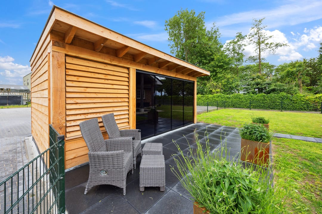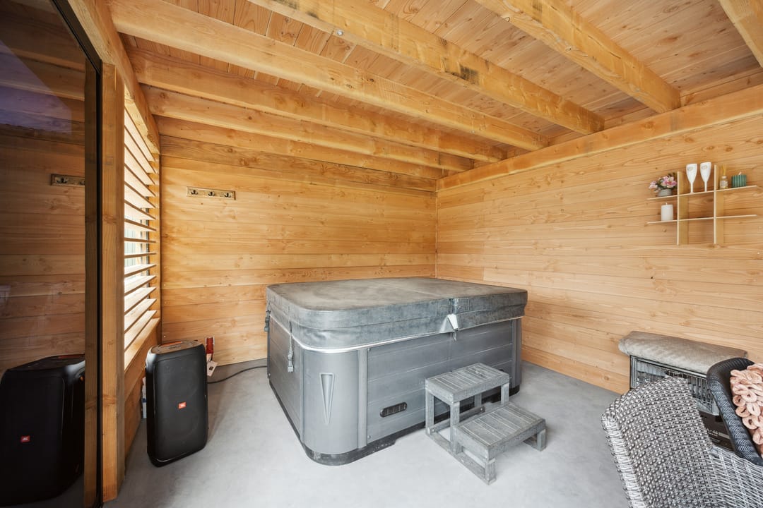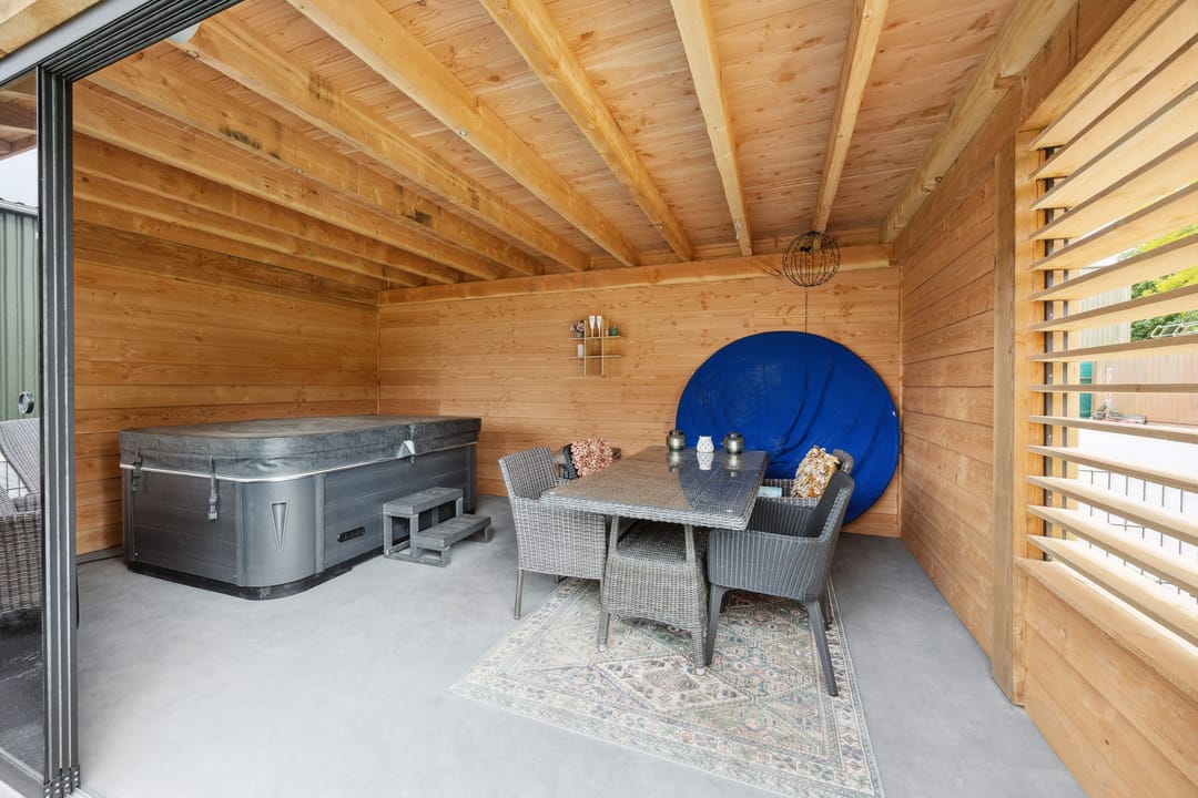 De tuin is een oase van rust met een overkapping, jacuzzi en tuinhuis – de ideale plek om te ontspannen na een drukke werkdag.