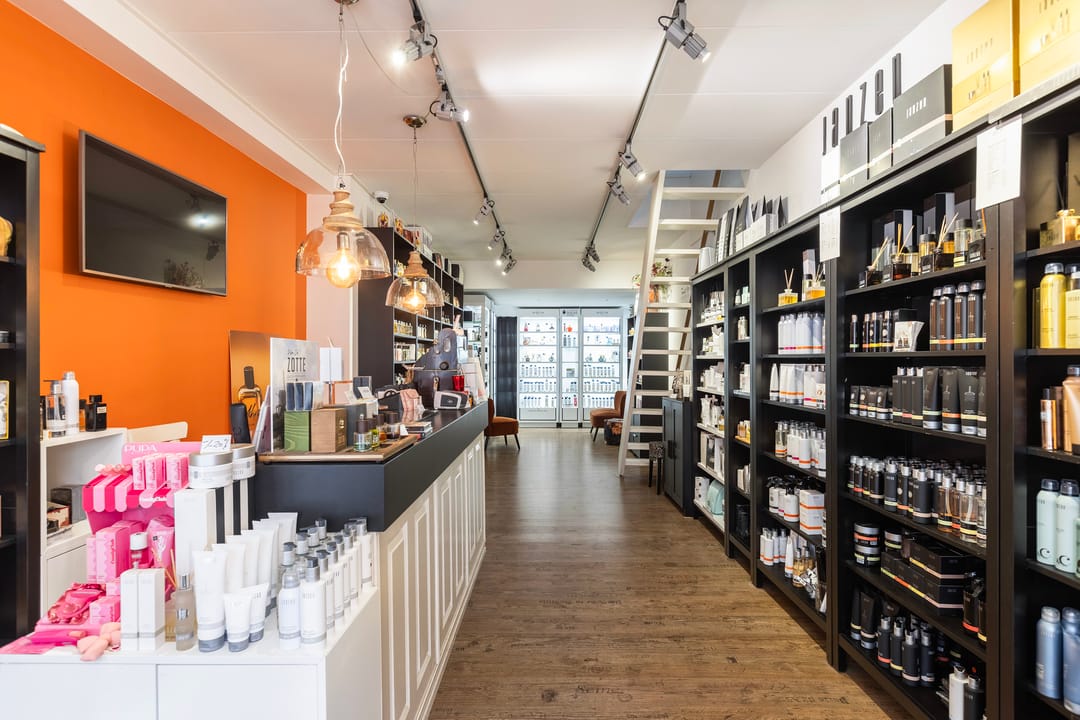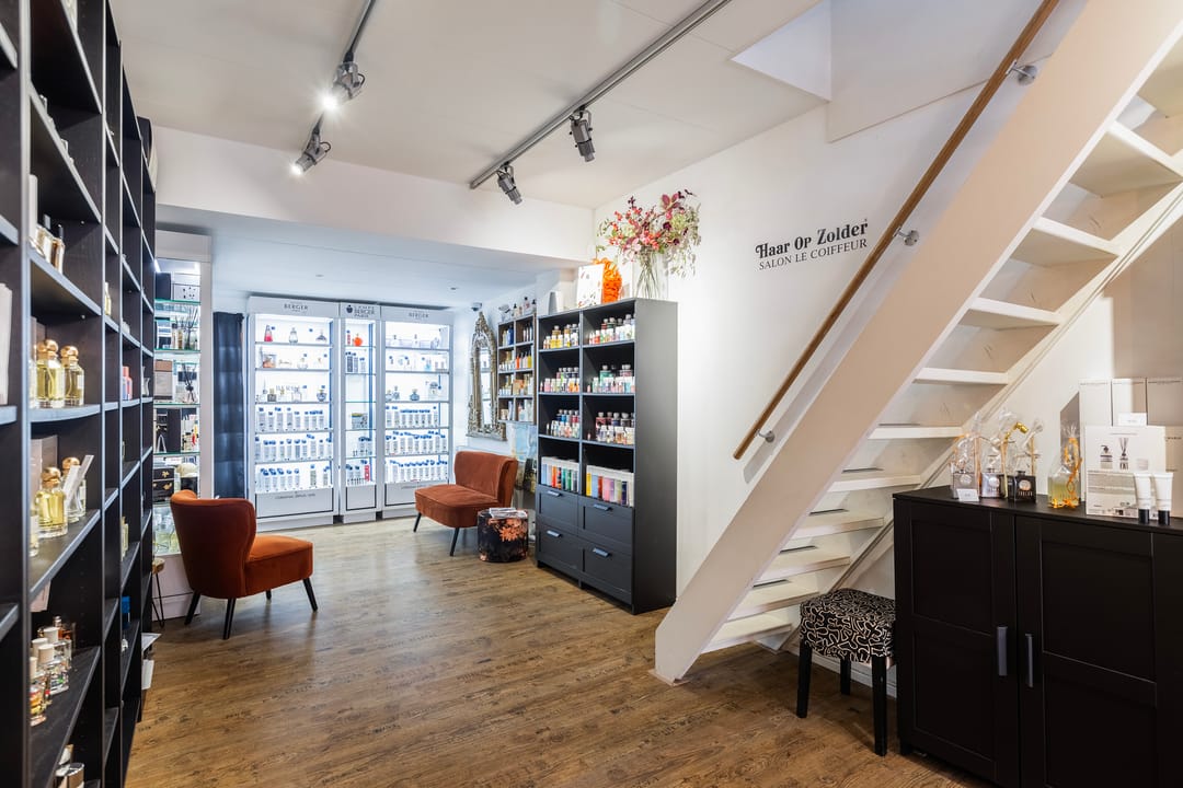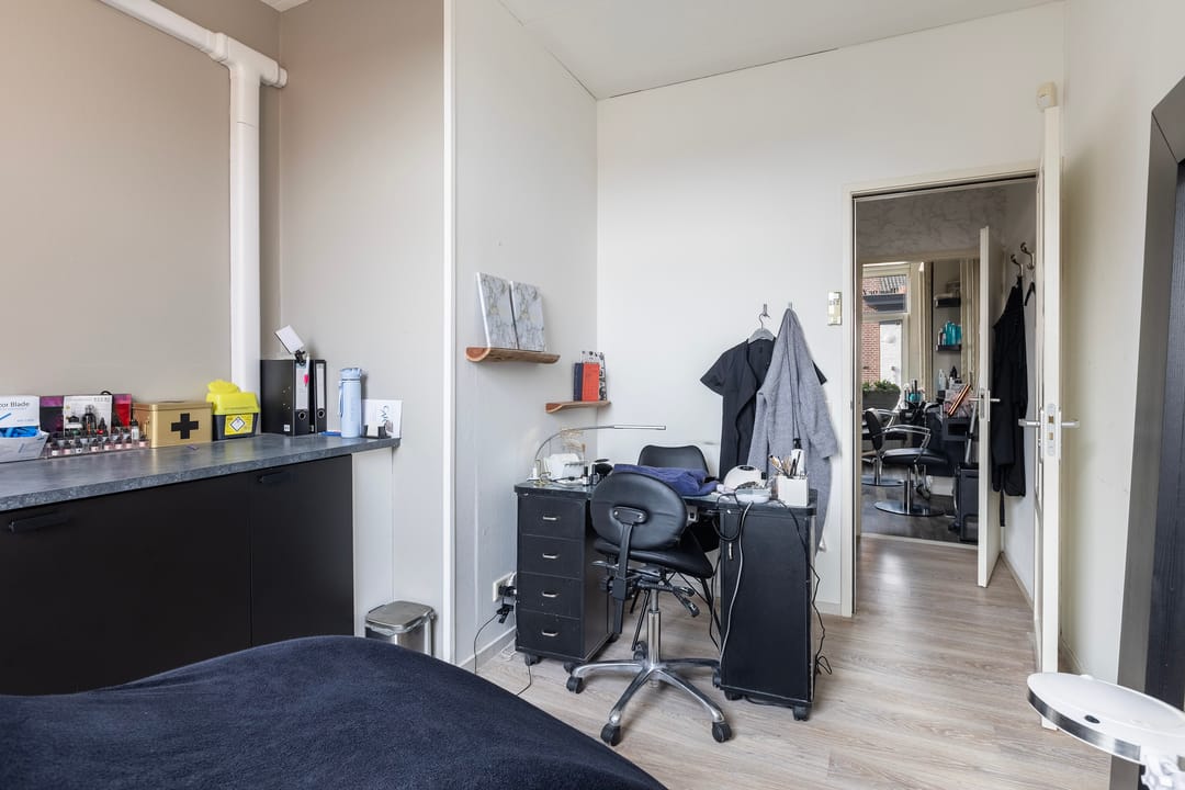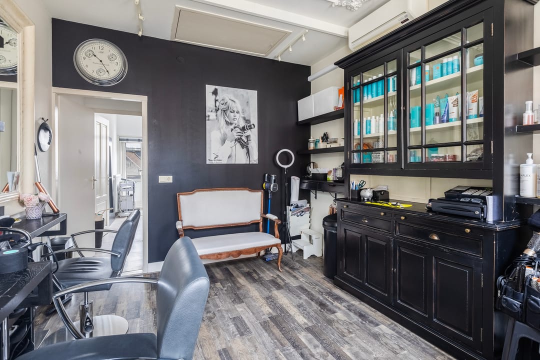 Via de trap in de winkel bereik je de eerste verdieping, waar je uitkomt op de overloop. Vanaf hier zijn twee separate ruimtes toegankelijk. Aan de linkerzijde bevindt zich de kapsalon: een lichte en representatieve ruimte met een prettige indeling en fijne daglichttoetreding. Aan de rechterzijde van de overloop is een allround permanente make-up en nagelstudio gevestigd, eveneens een verzorgde en efficiënt ingedeelde ruimte die zich uitstekend leent voor diverse gebruiksdoeleinden.