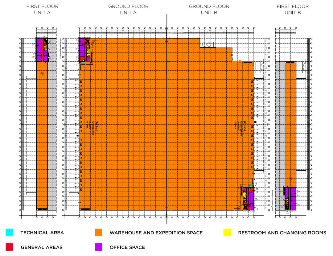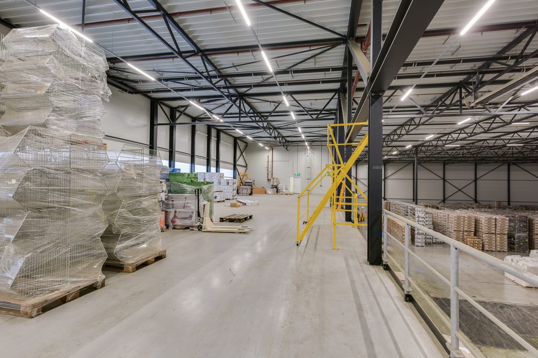 - Lichtstraten, loading docks, overheaddeuren, krachtstroom, betonvloer, sprinkler, heater, toilet en pantry