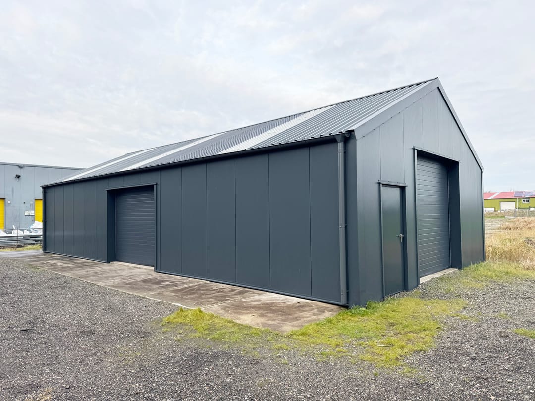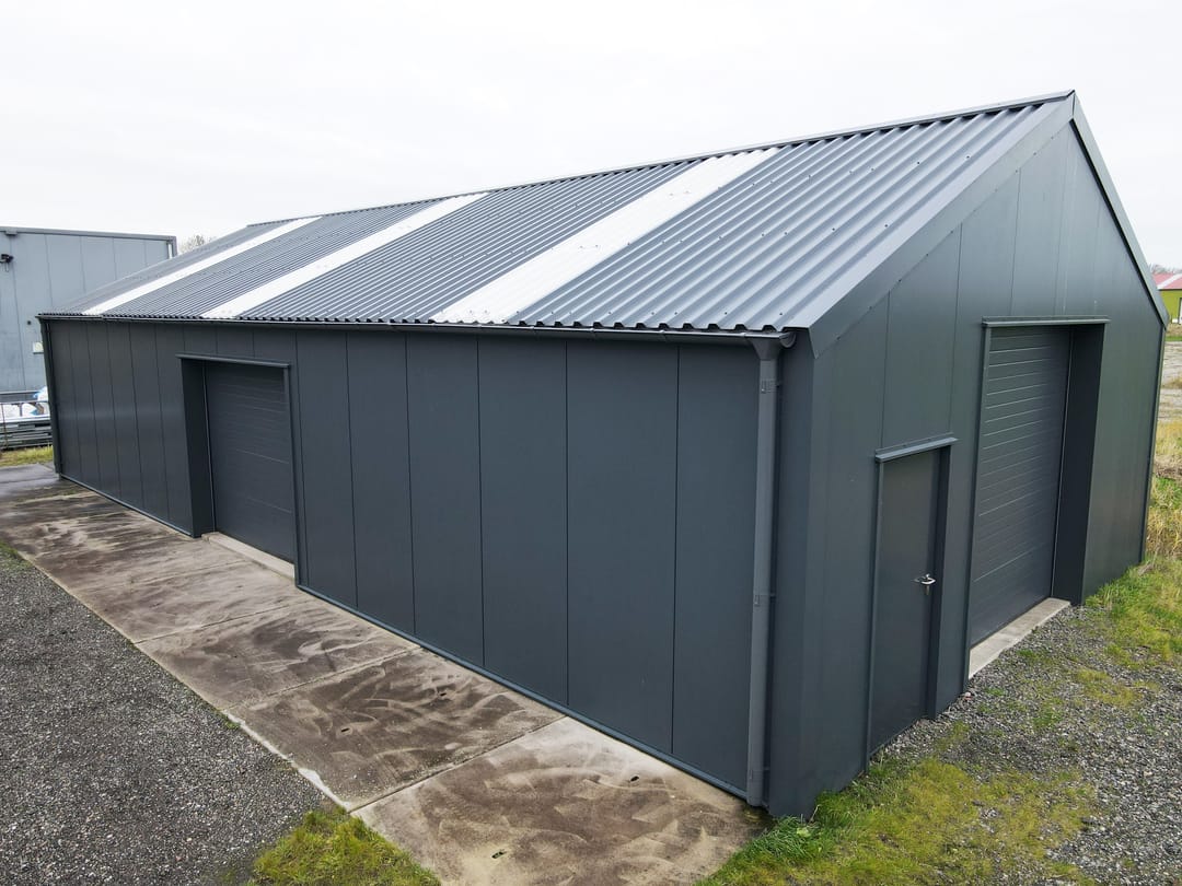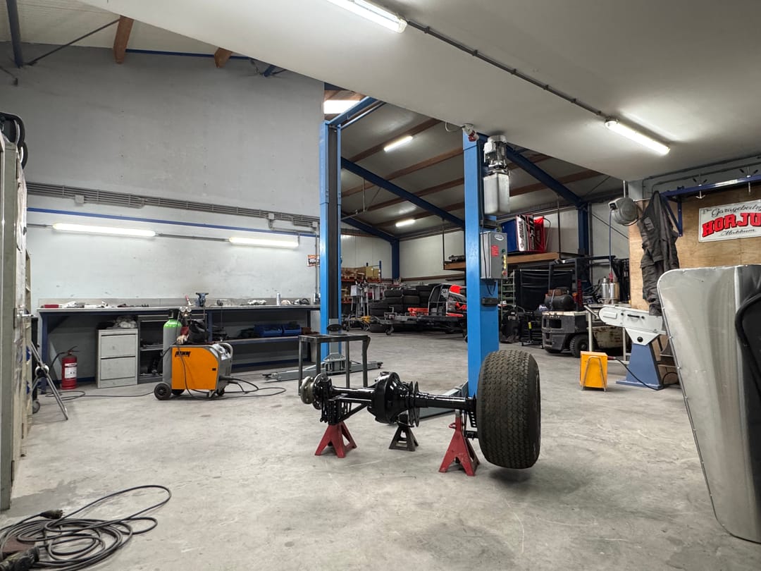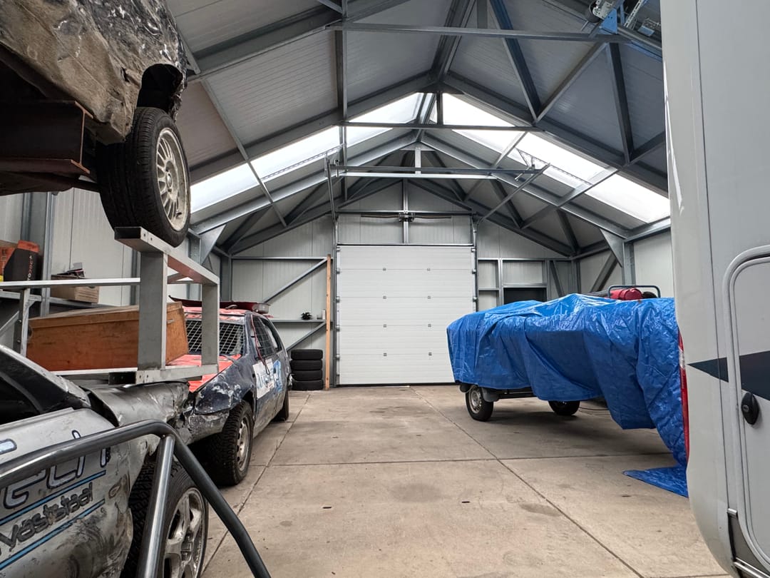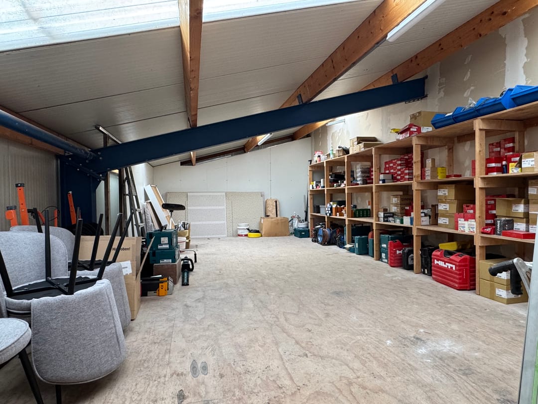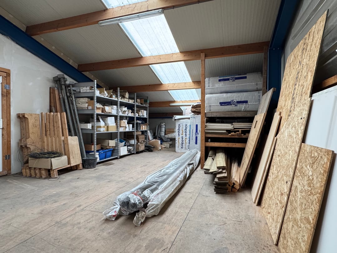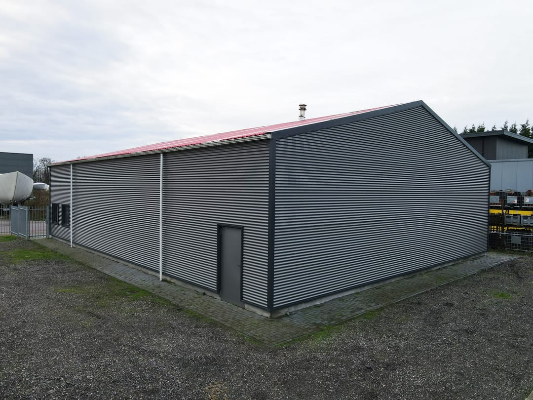 Ca. 120 m2 met een vrije hoogte van ca. 395 cm en een goothoogte van ca. 280 cm. De hal heeft aan de kopse kanten een overheaddeur van elk 300 x 300 cm en aan de langsgevel een overheaddeur van 300 x 250 cm.