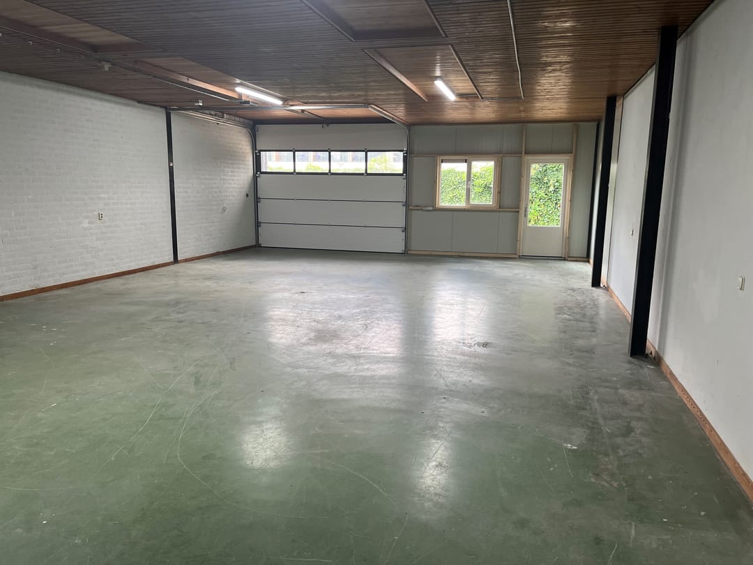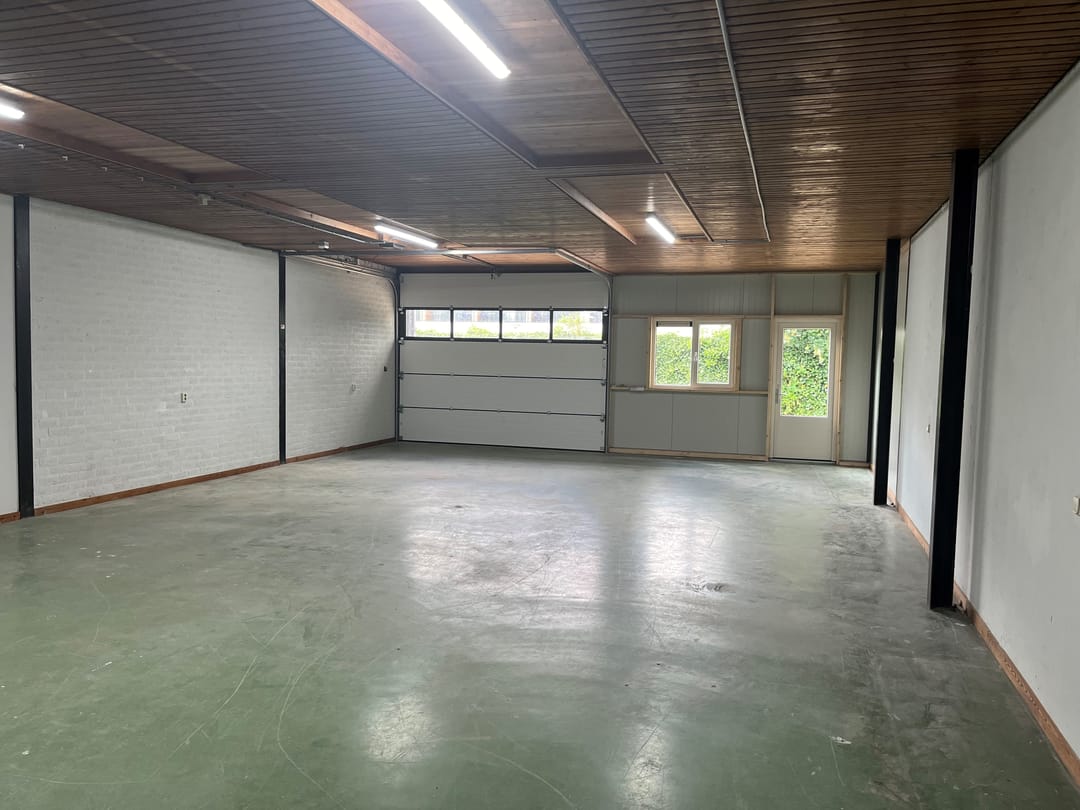 Elektrische overheaddeur van ca. 3,80 (b) x 3,00 (h) met afstandsbediening; loopdeur; kantoor/kantineruimte van ca. 15 m² (ca. 2,50 x 6 m); hoogte ca. 3 meter.