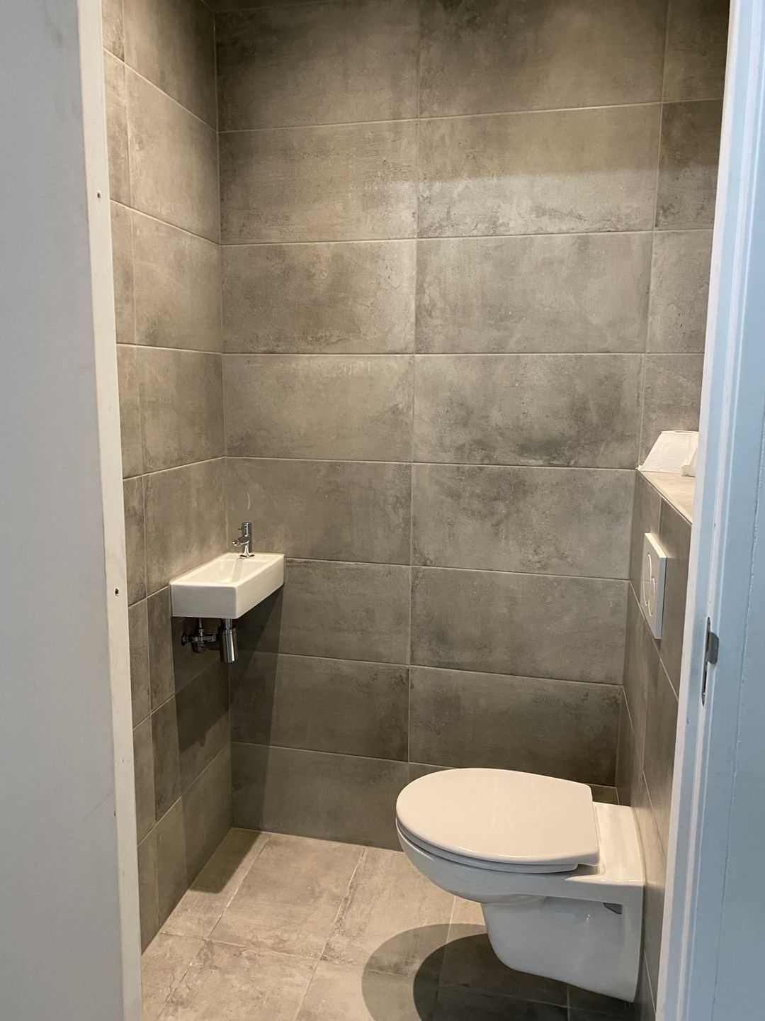 • Moderne toiletruimte met hangtoilet en wasbak en een modern keukenblok met boiler