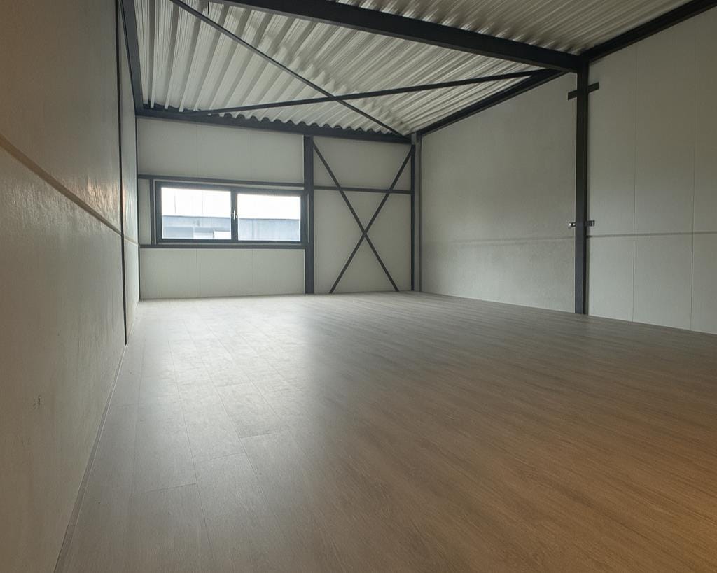 Casco bedrijfsunit: Een volledig casco bedrijfshal voorzien van een betonnen verdiepingsvloer afgewerkt met laminaat, overheaddeur, elektra en wateraansluiting. De unit is volledig naar eigen zinnen in te richten.