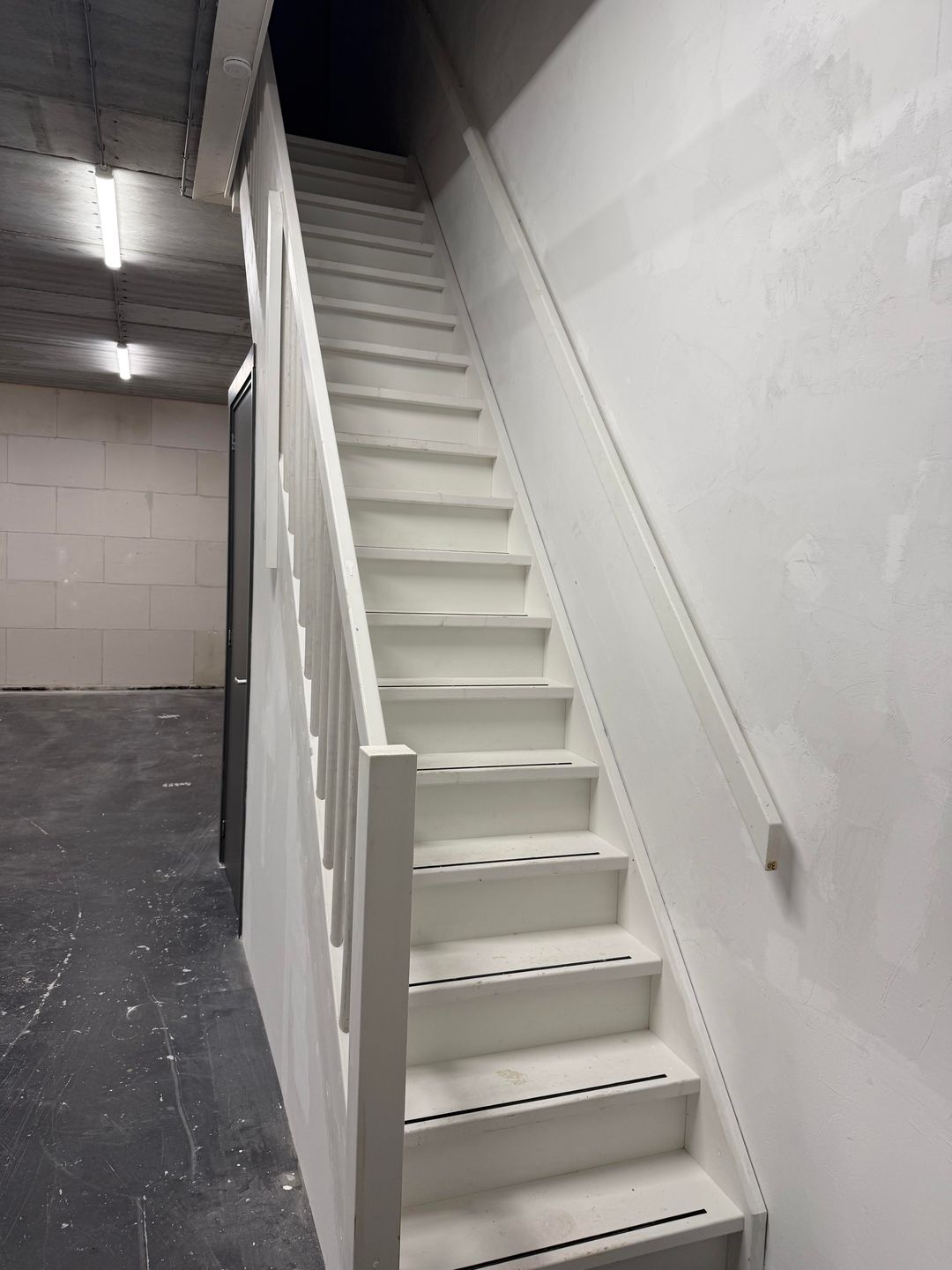 Vaste trap naar overloop met toegang tot 2 afzonderlijke ruimtes (waarvan de ruimte aan de voorzijde voorzien van raampartij met 2 draai-/kiepramen).