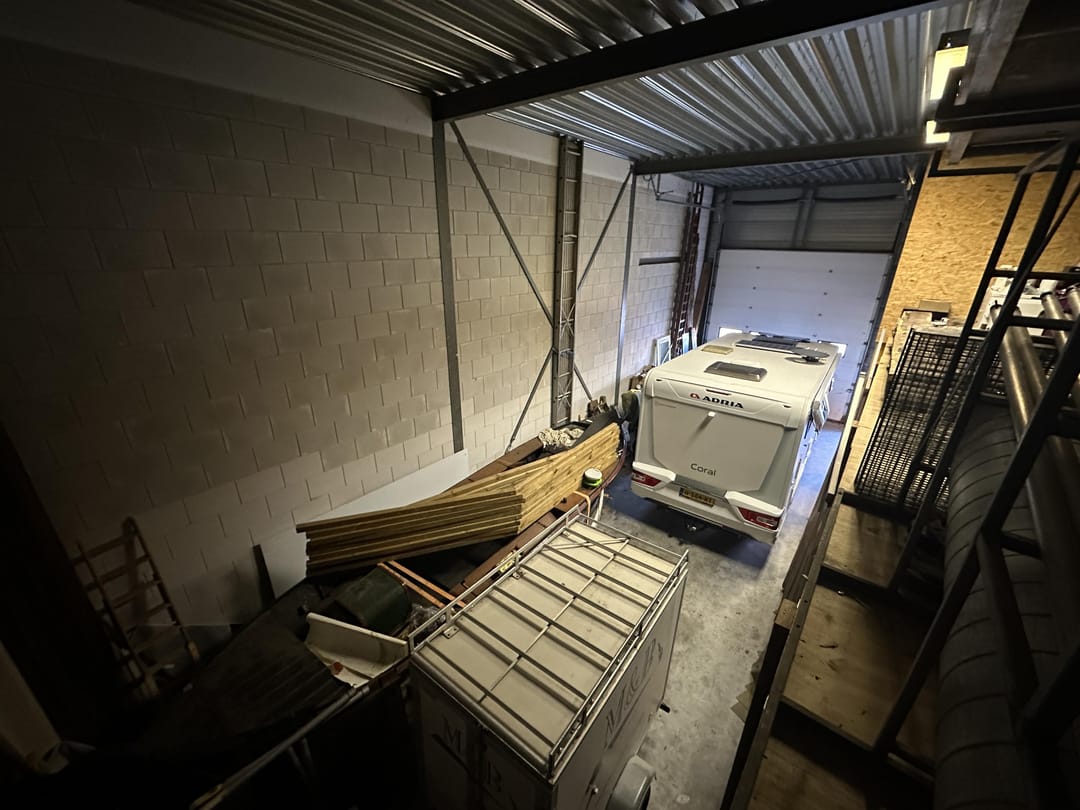 - Overheaddeuren, krachtstroom, betonvloer, toilet, inbouwarmaturen en te openen ramen