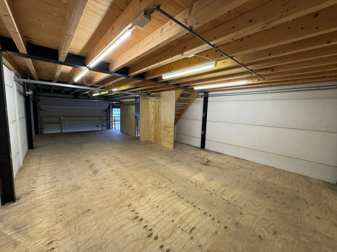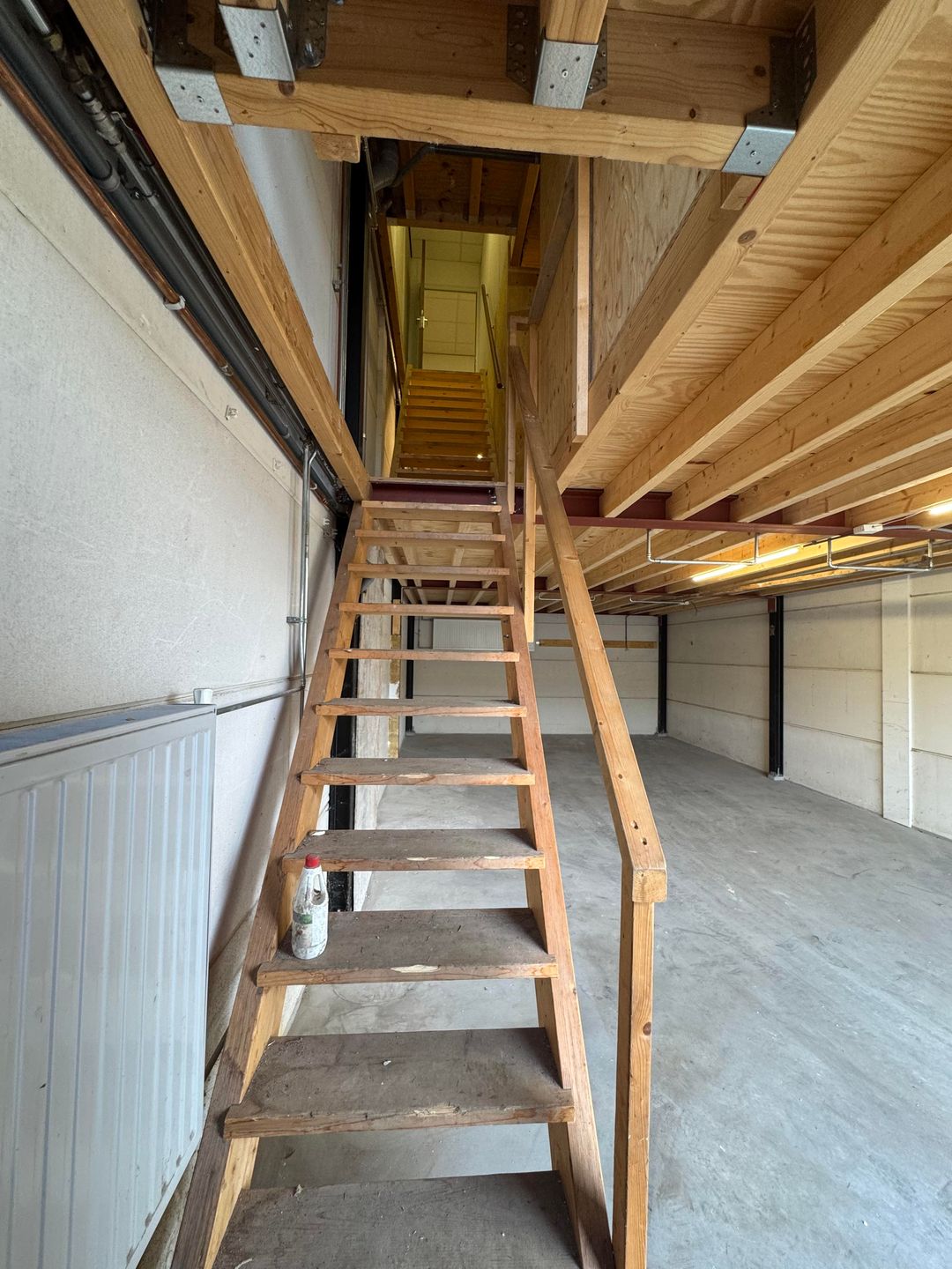 Open verdiepingsvloer met courante draagkracht (staalconstructie met houten vloer), geschikt voor opslag of werkruimte.