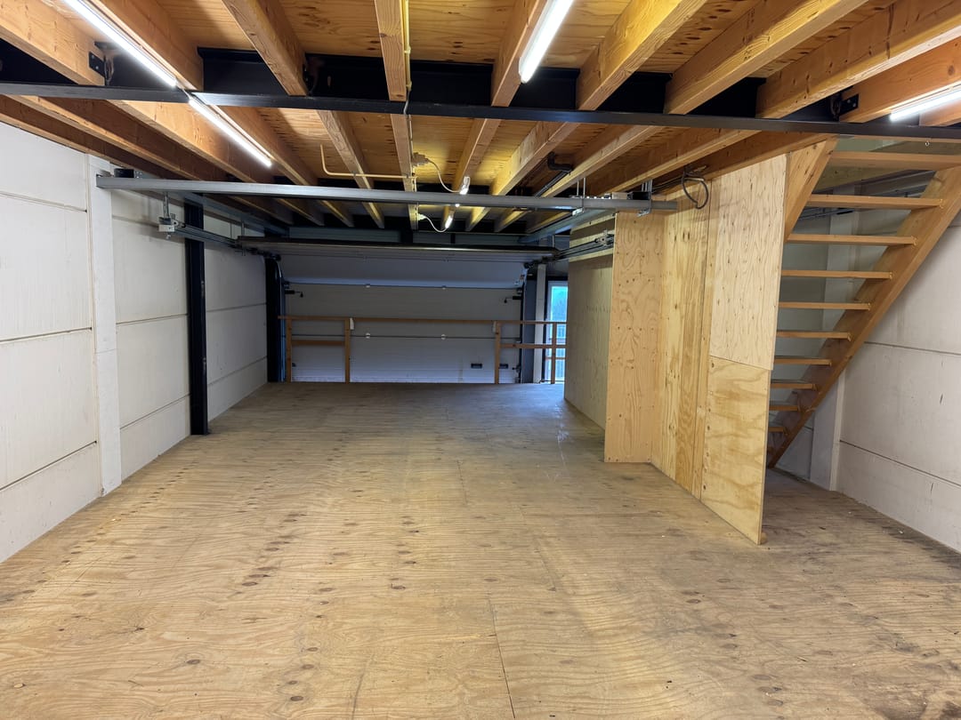 Bedrijfsruimte met betonnen vloer (ca. 1.500 kg/m²), royale overheaddeur, separate loopdeur, meterkast en een vaste houten trap naar de verdiepingen.