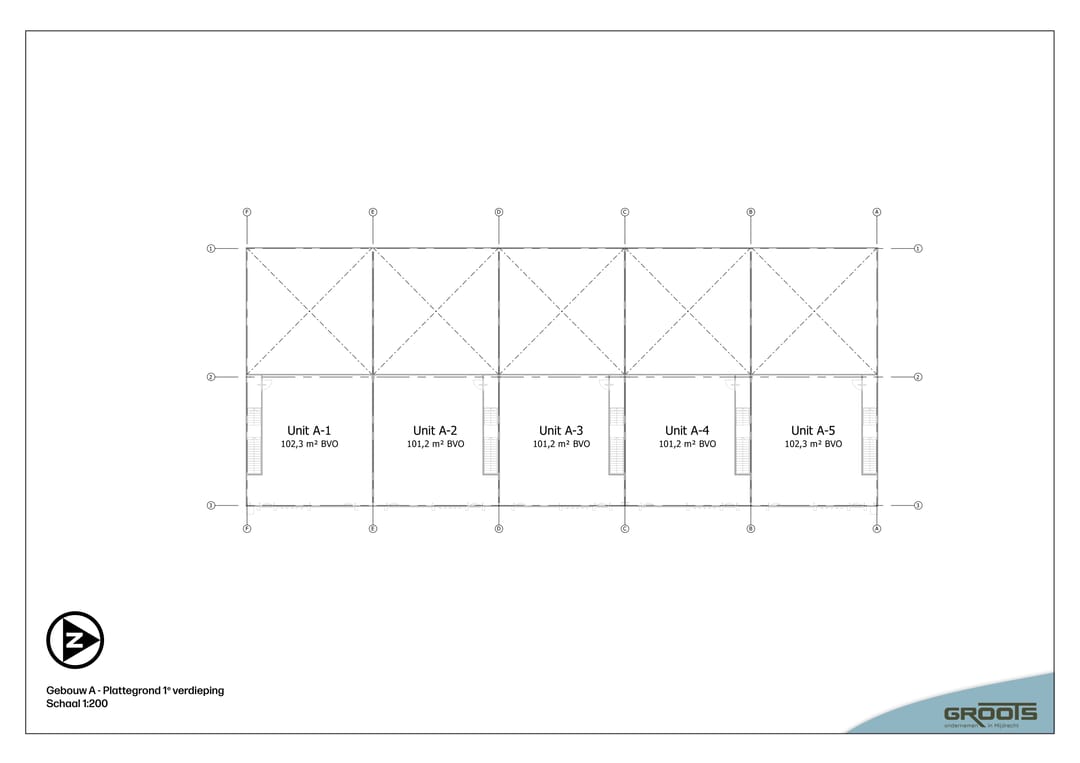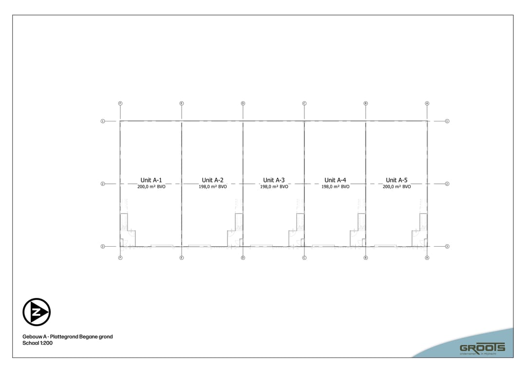 Het project bestaat uit twee gebouwen: gebouw A met vijf grotere units, op de begane grond ca. 198 m² BVO en op de verdieping in basis de helft, dus in totaal 297 m² BVO. De units zijn onderling te koppelen, en de verdiepingsvloer is optioneel volledig dicht te leggen. De overheaddeuren van deze units hebben een vrije hoogte van ca. 4 m.