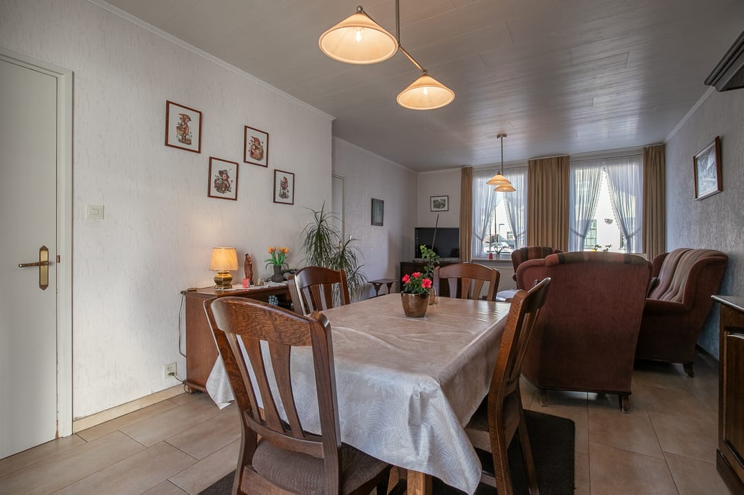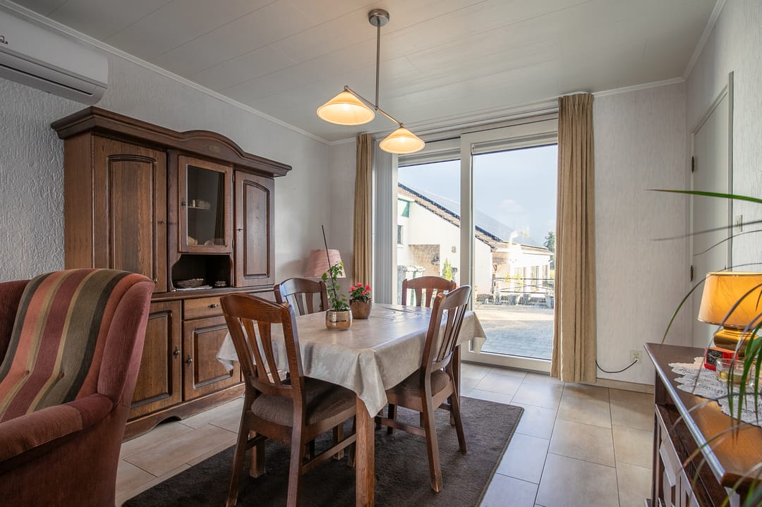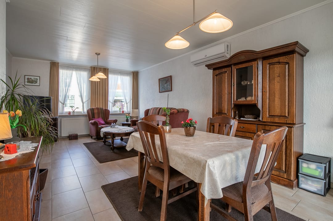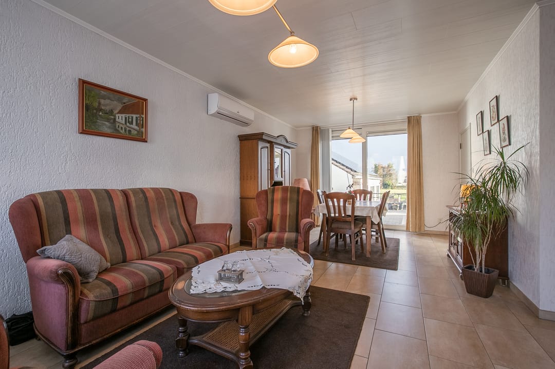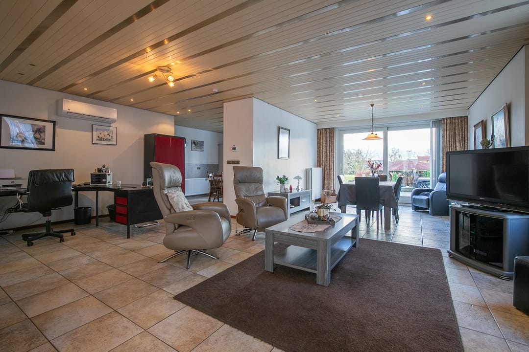 L-vormige woonkamer (ca. 26 m²) met tegelvloer, vloerverwarming en airco-installatie (2023). Via schuifpui toegang tot de achtertuin.