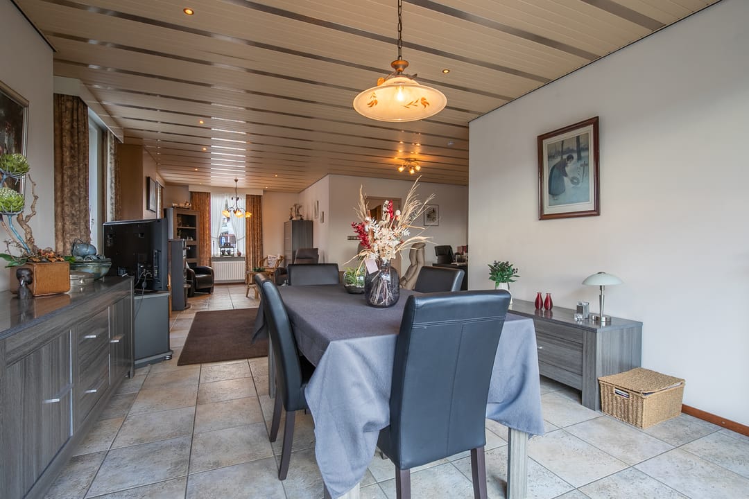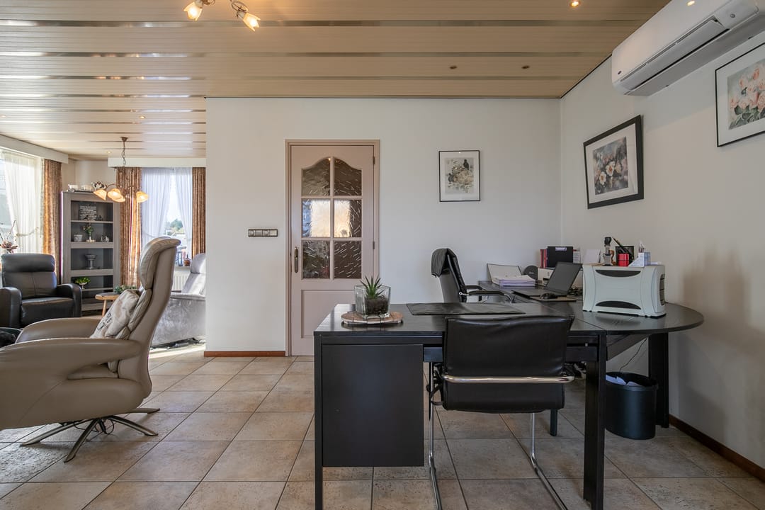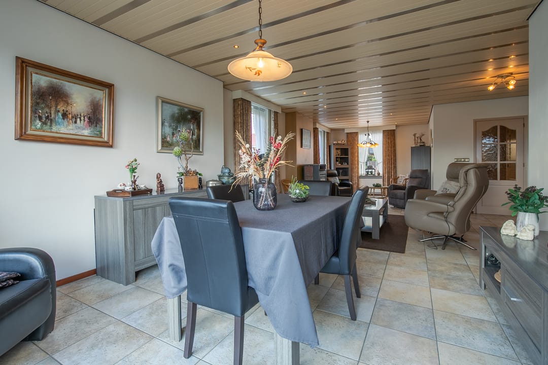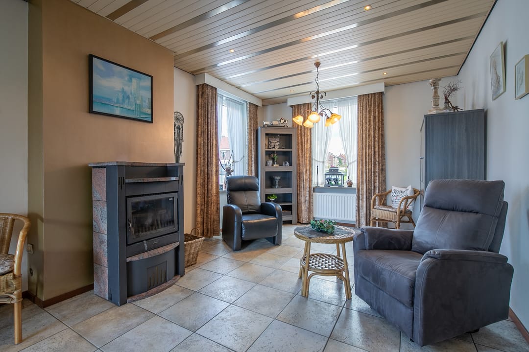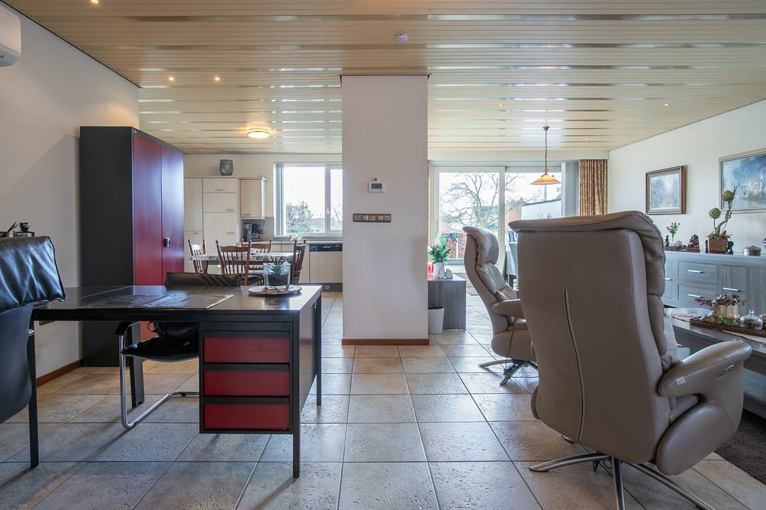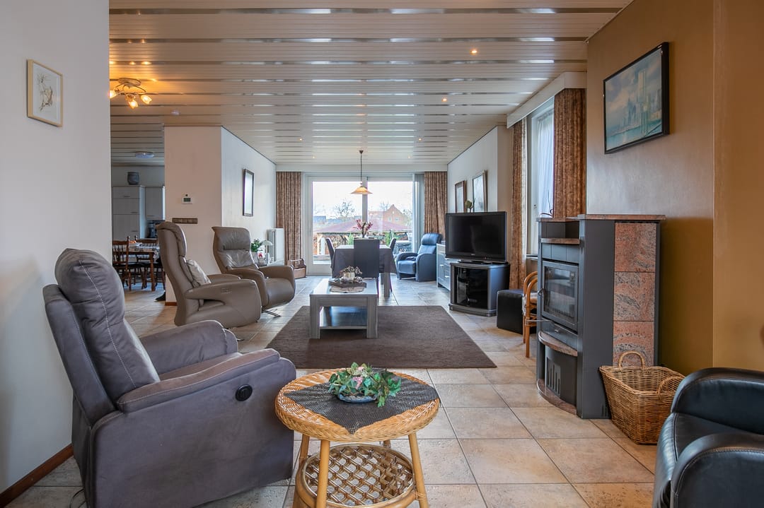 Zeer royale woonkamer met doorlopende tegelvloer en vloerverwarming. Aan de achterzijde is in 2000 een aanbouw gerealiseerd, waardoor een indrukwekkende leefruimte is ontstaan. De woonkamer is voorzien van een houtkachel en airco-installatie (2023) en staat via een schuifpui in directe verbinding met het terras en de tuin.