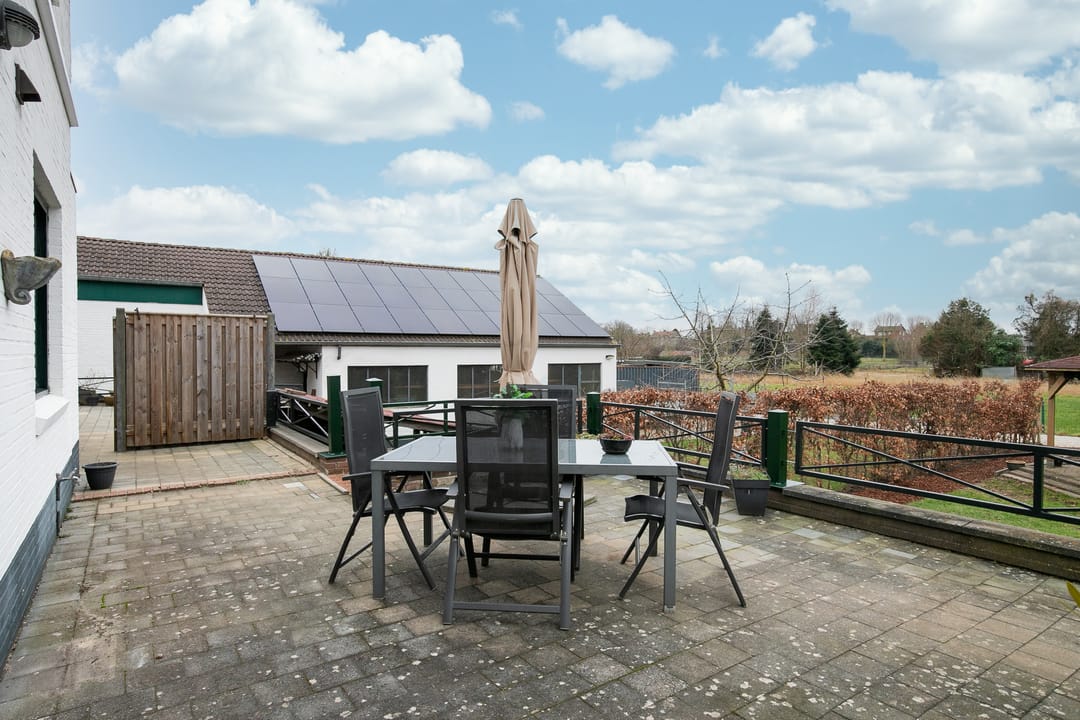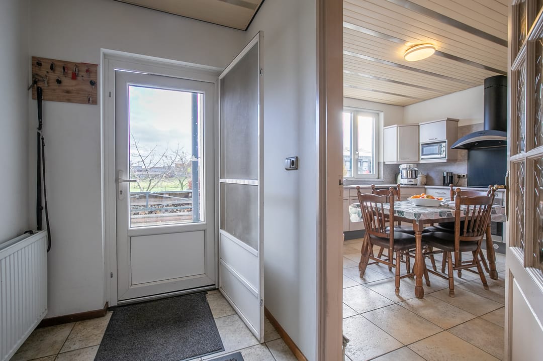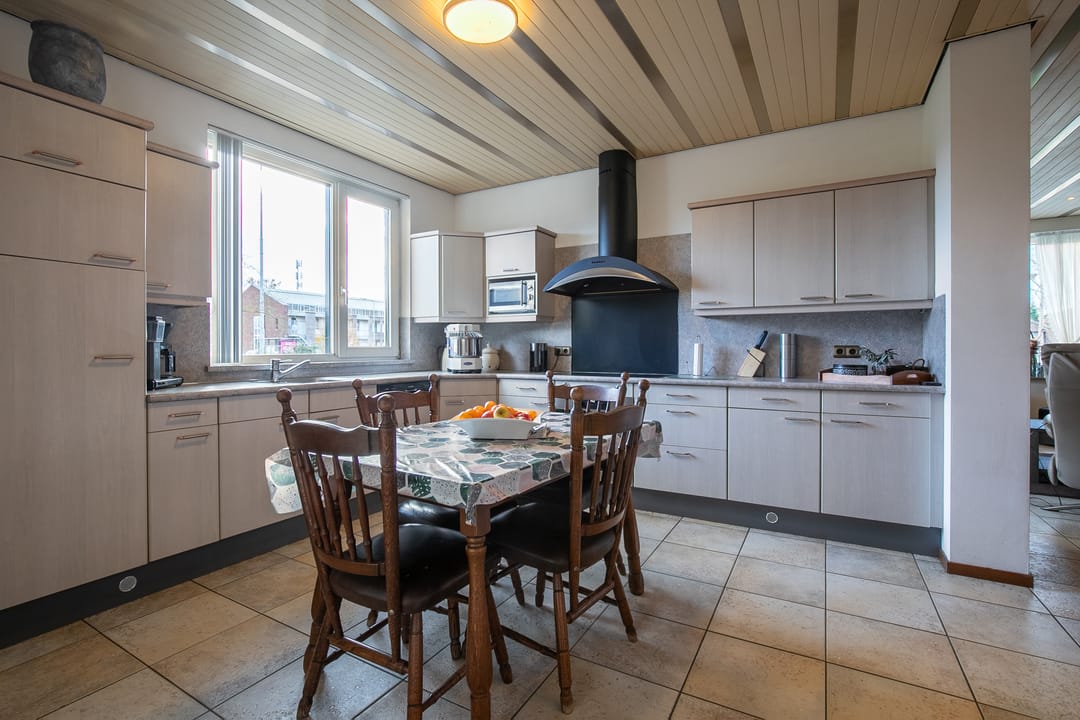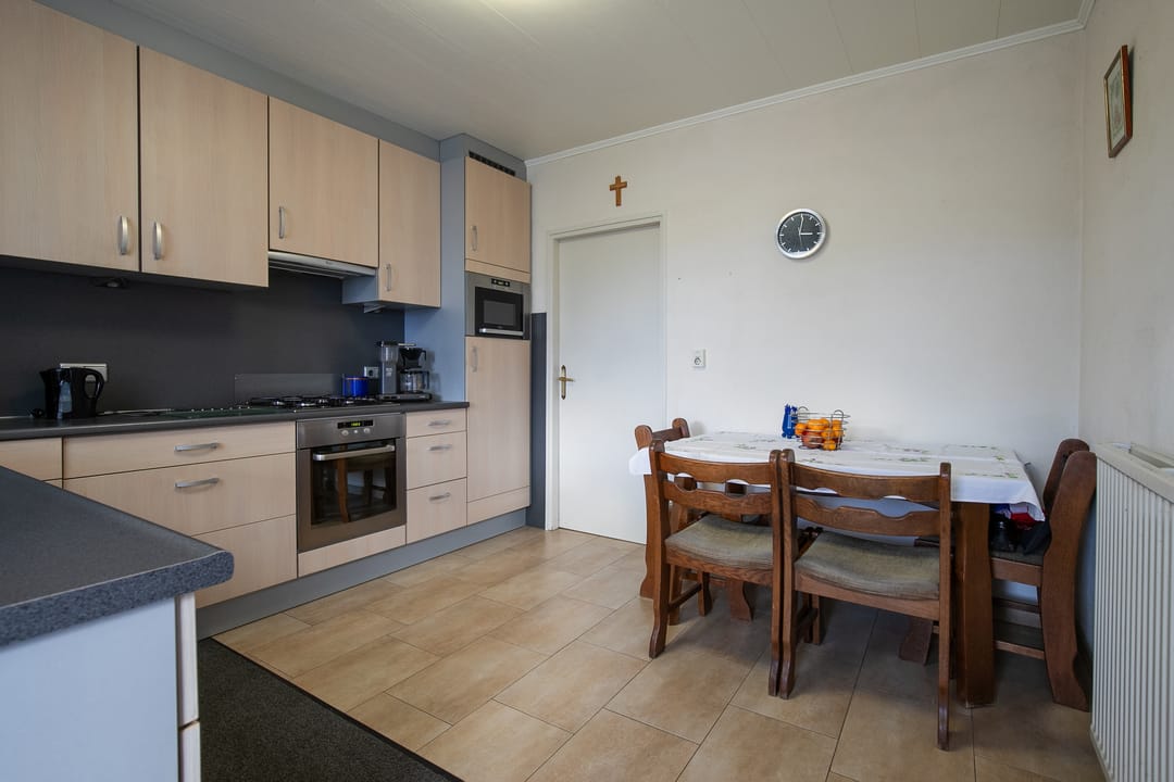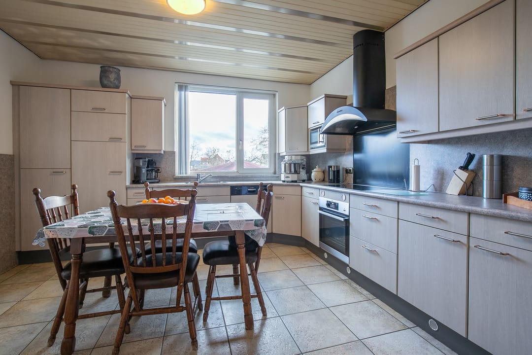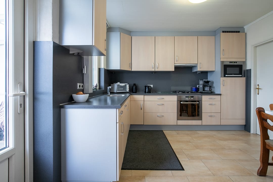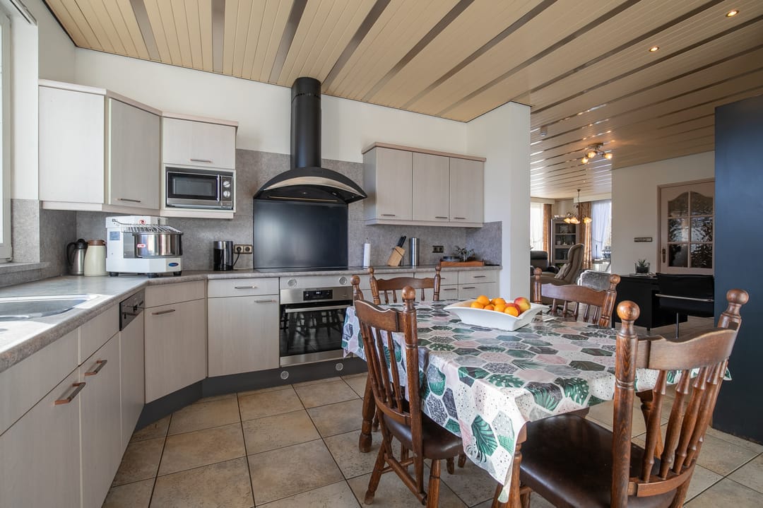 Gesloten keuken (ca. 12 m²) met hoekopstelling, voorzien van koelkast, gaskookplaat, afzuiging, oven, magnetron, vaatwasser en veel kastruimte. Vanuit de keuken toegang tot een overdekt terras.