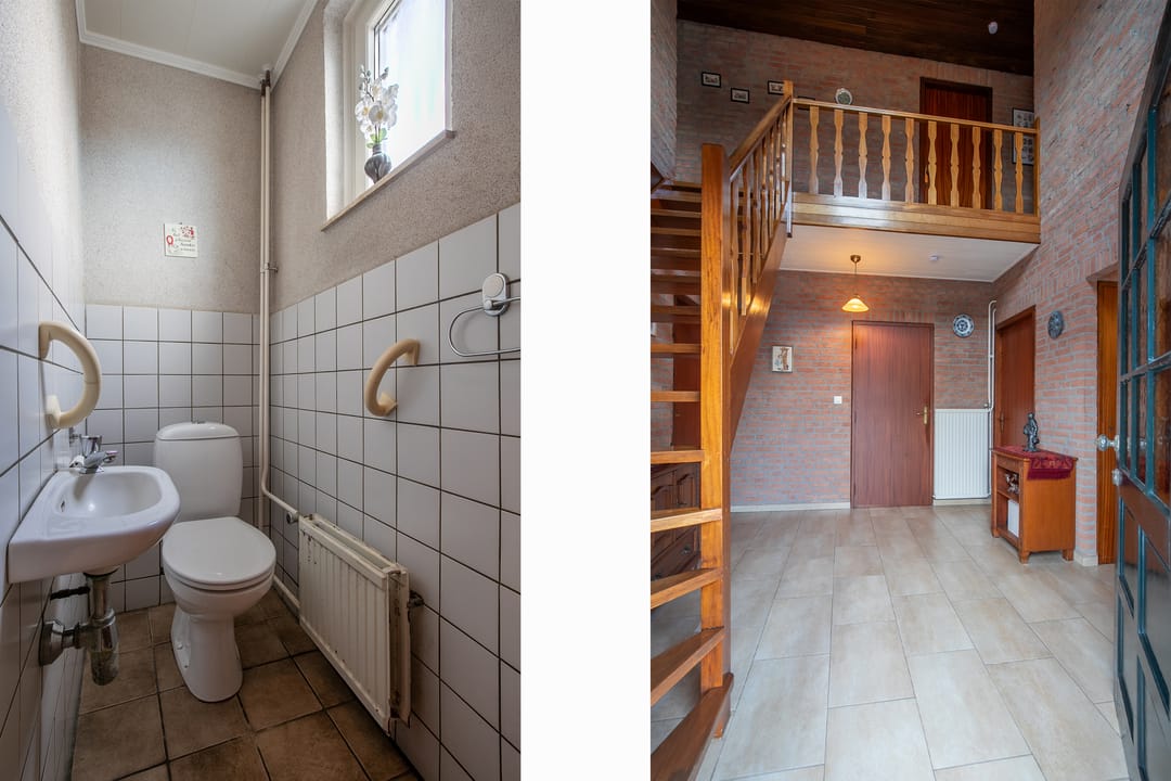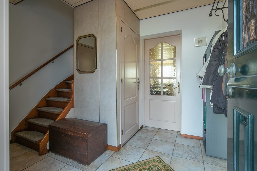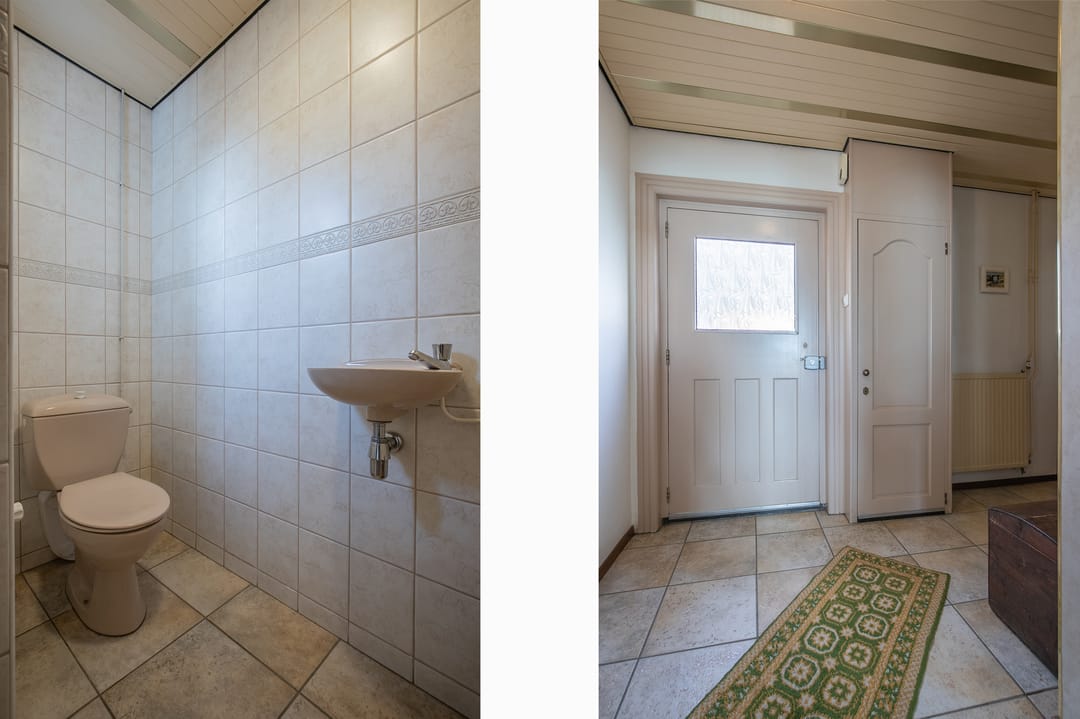Entree/hal met tegelvloer, trapopgang, garderobenis, meterkast en toegang tot woonkamer, keuken, berging en toiletruimte. Deels betegeld gastentoilet met fonteintje.