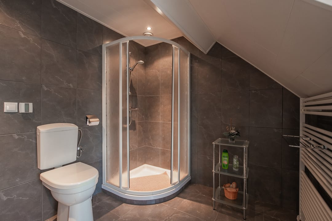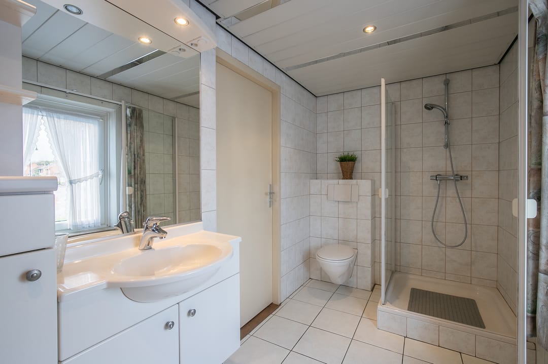 Betegelde badkamer (ca. 5 m²) met douche, wastafelmeubel en toilet.