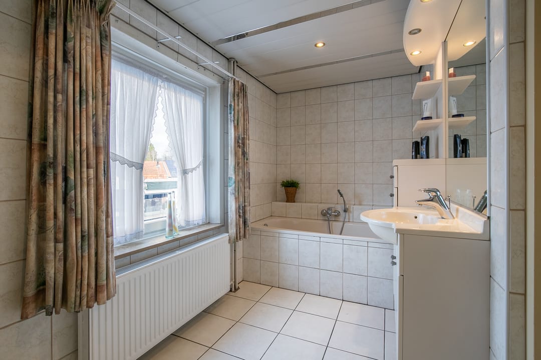 Geheel betegelde badkamer (ca. 7 m²) met ligbad, douche, wastafelmeubel en zwevend toilet.